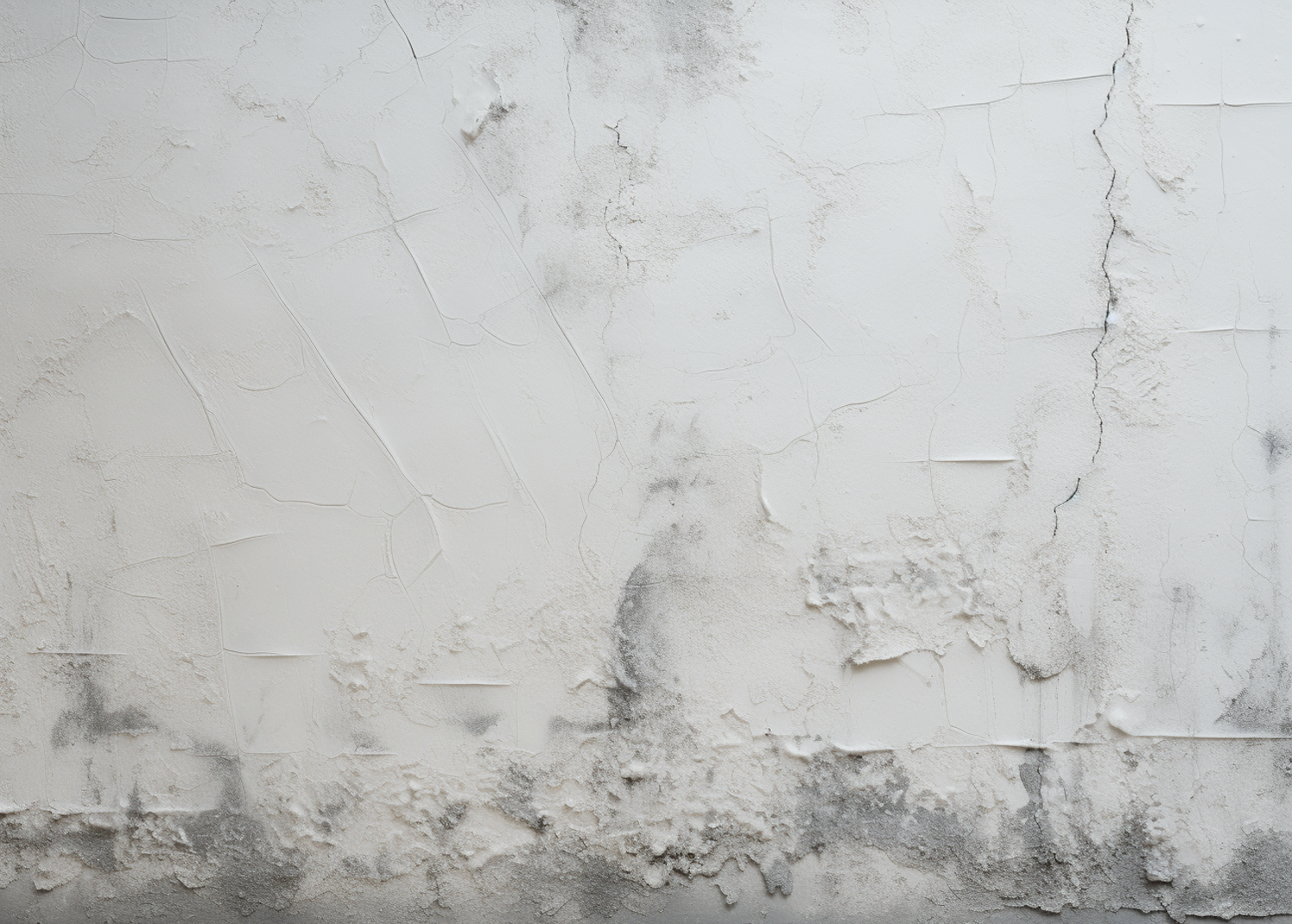 A distressed white wall with cracks and mold, showing signs of water damage and wear.