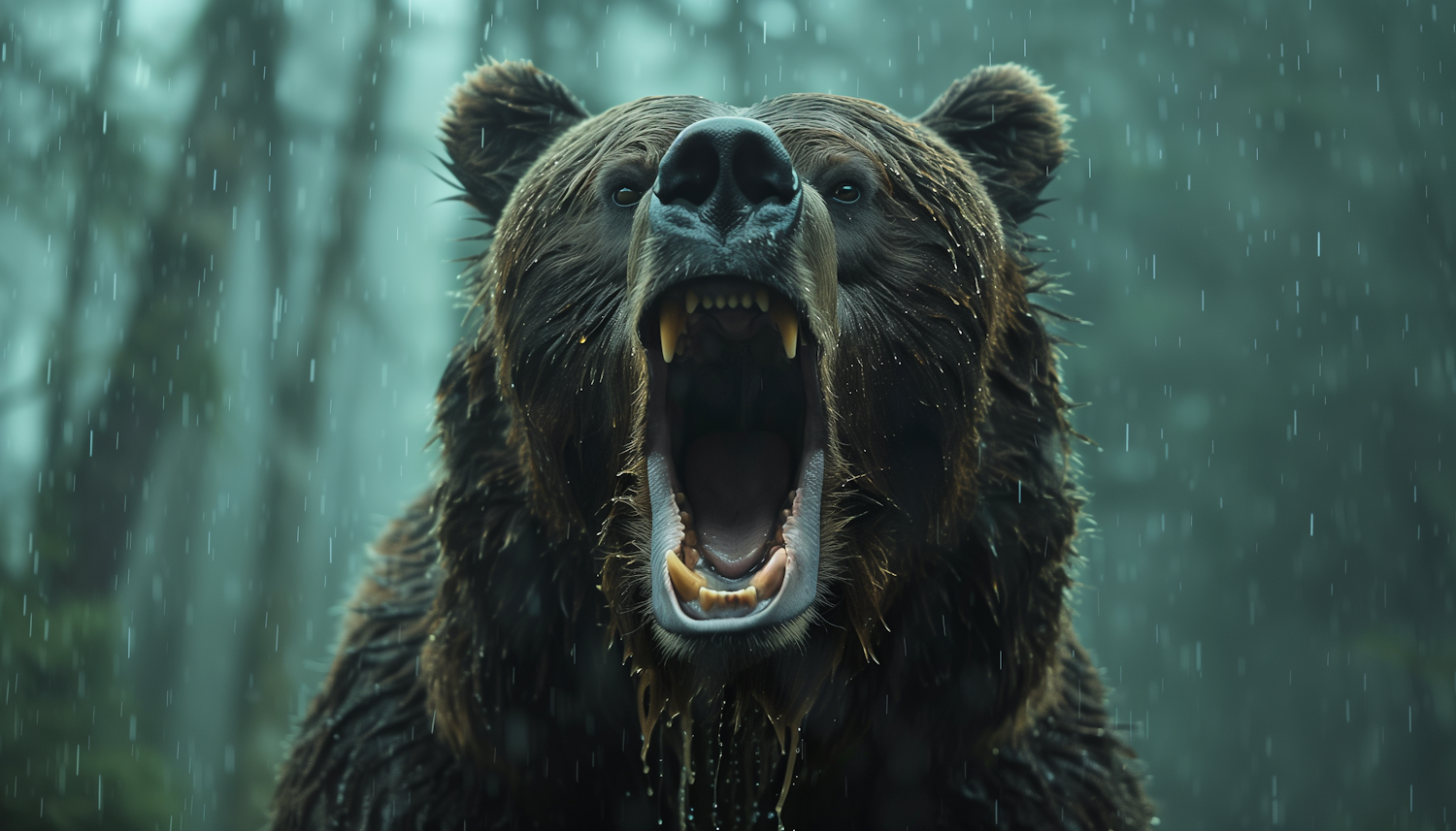 A roaring brown bear in the rain, showcasing its sharp teeth and wet fur against a misty forest backdrop.