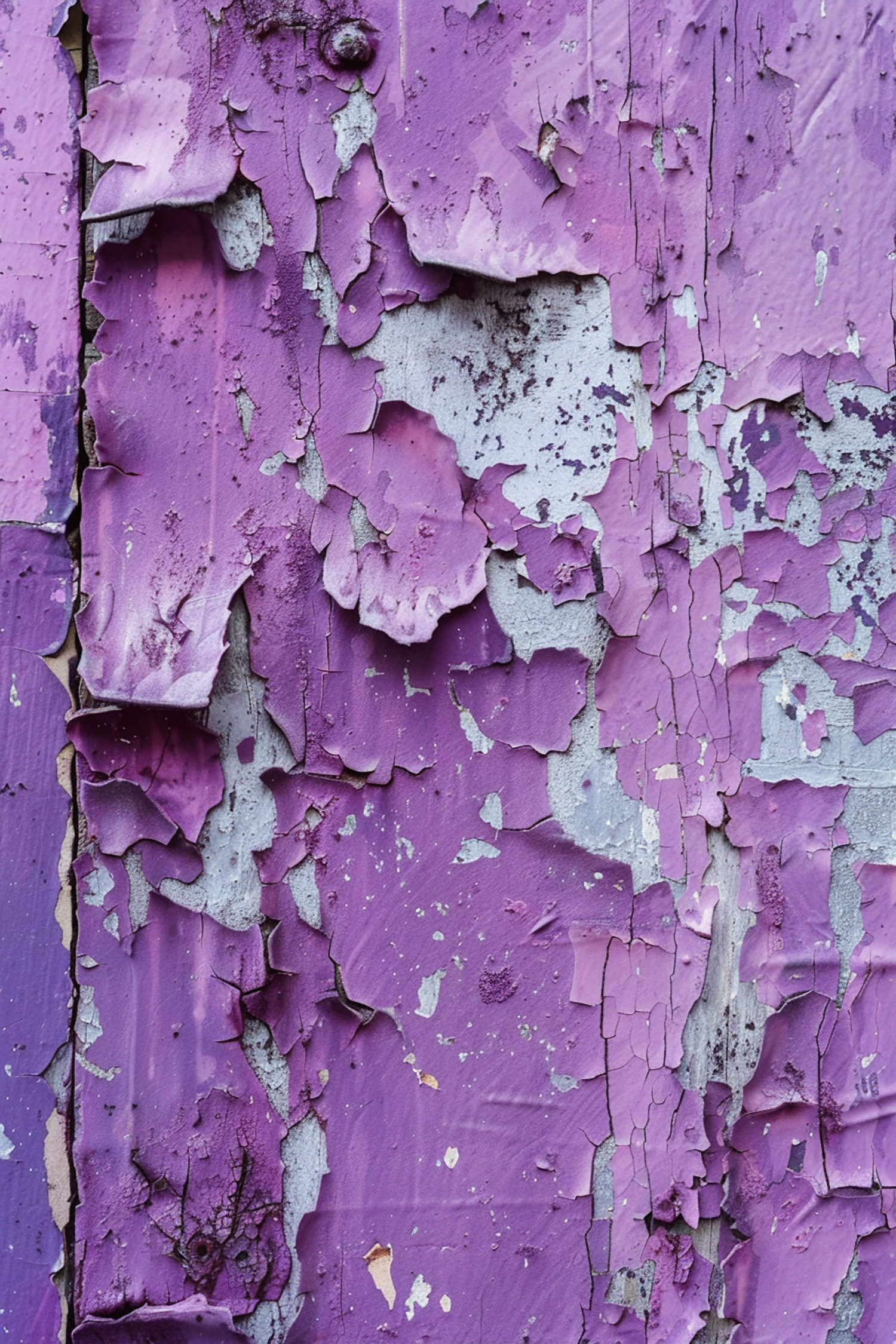 Close-up of peeling purple paint on a weathered surface, revealing a textured and rustic appearance with varying shades of purple.