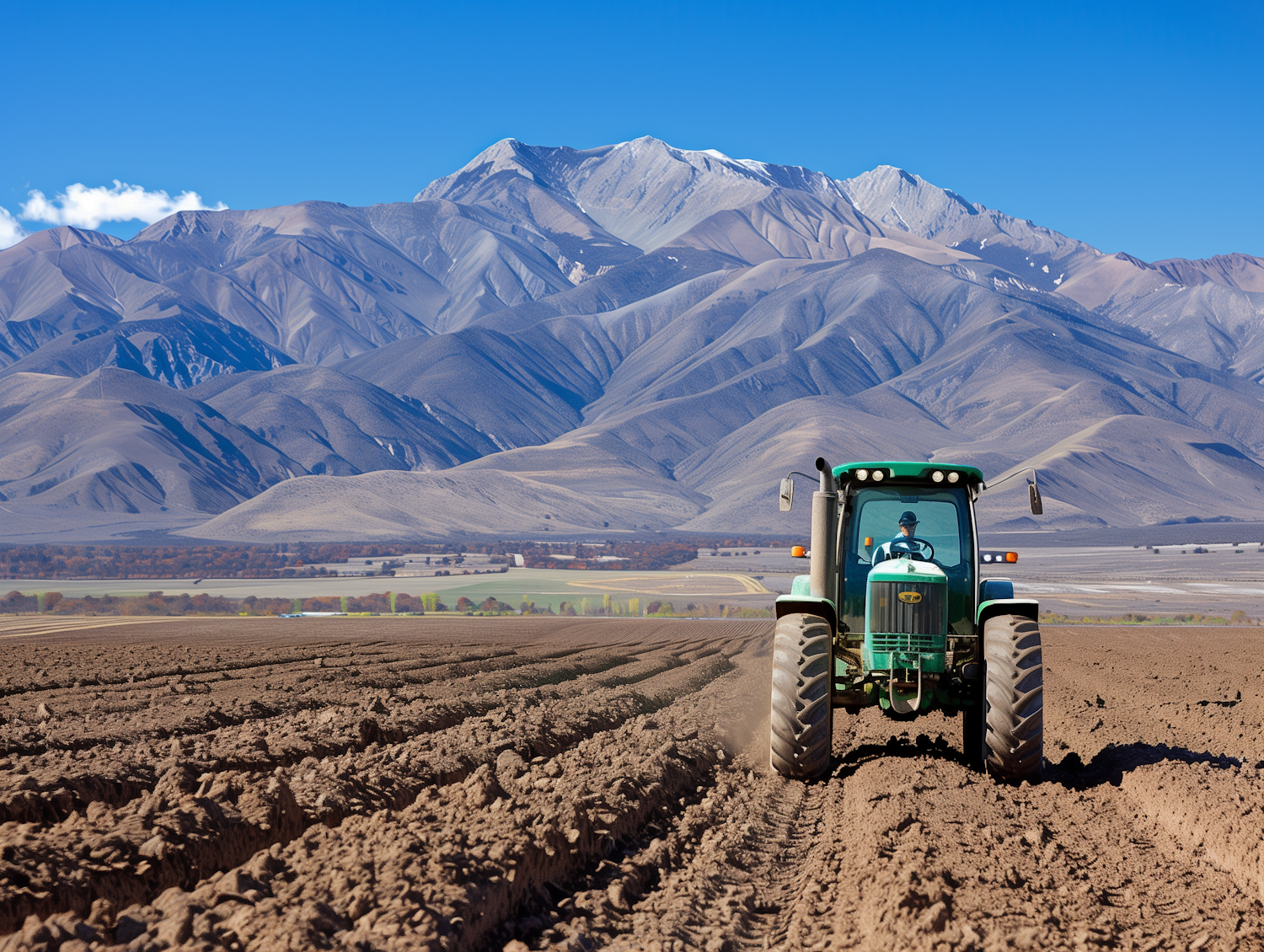 Green tractor plowing a field with majestic mountains in the background under a clear blue sky.