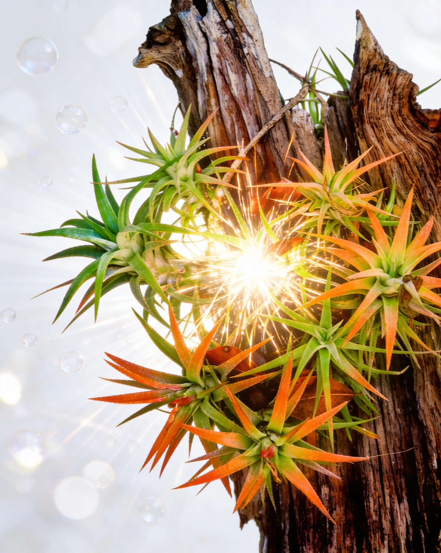 A close-up of colorful air plants on wood with a glowing light effect and floating bubbles, creating a magical and vibrant scene.