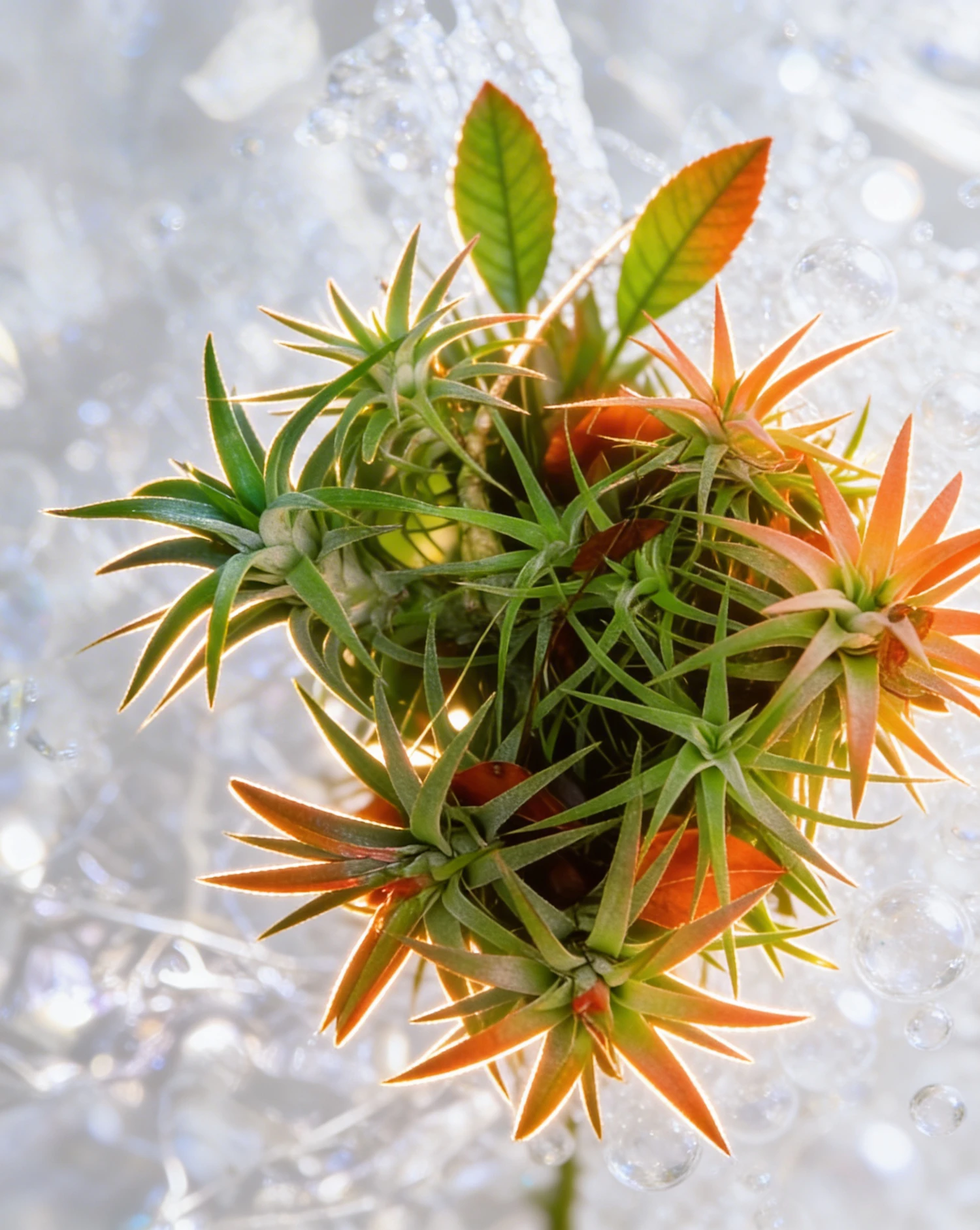 A close-up of colorful air plants with green and orange hues, surrounded by glistening water droplets in soft light.
