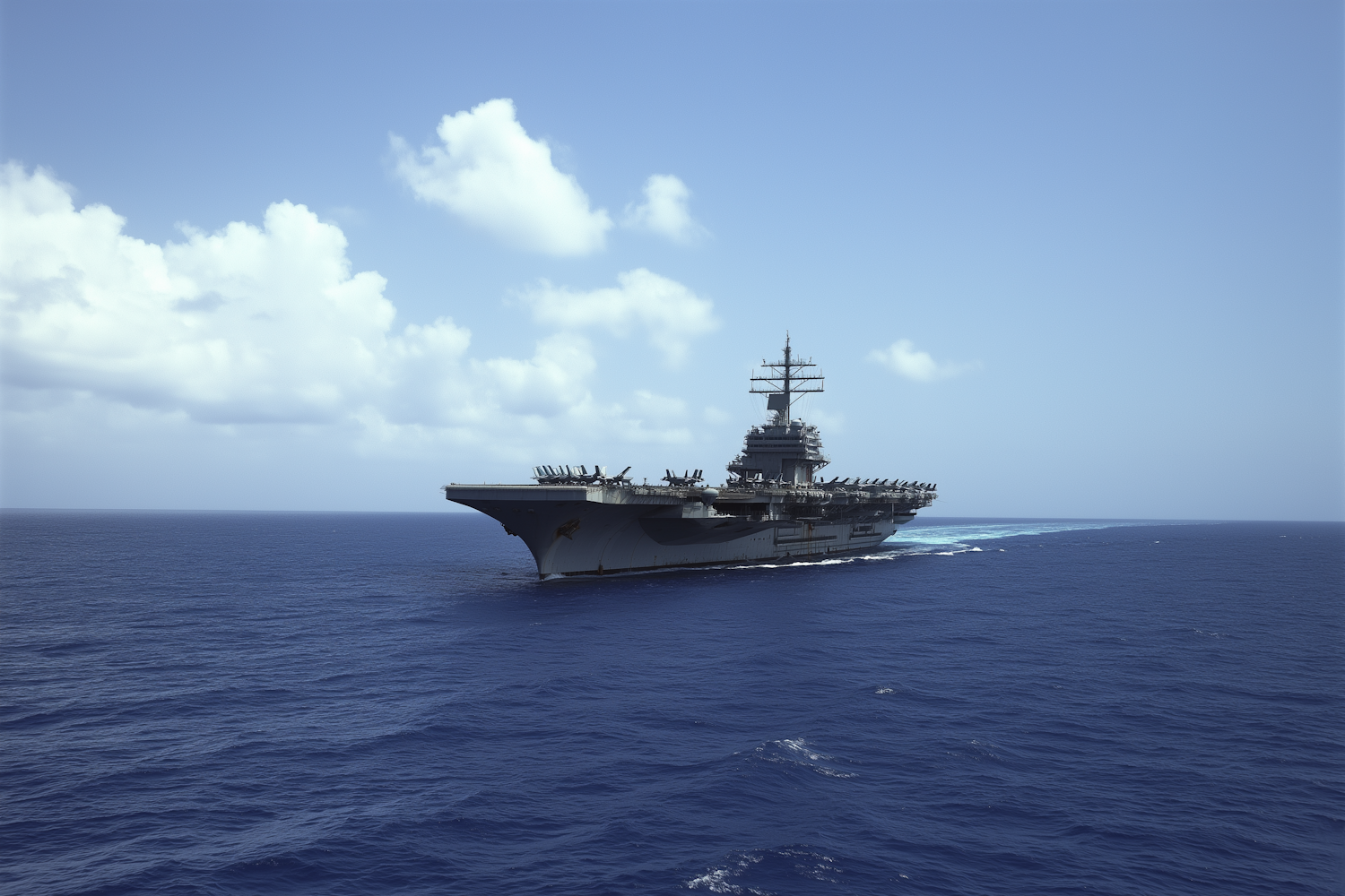 Massive aircraft carrier cruising through calm blue waters under a sunny sky, with fighter jets lined up on its deck.