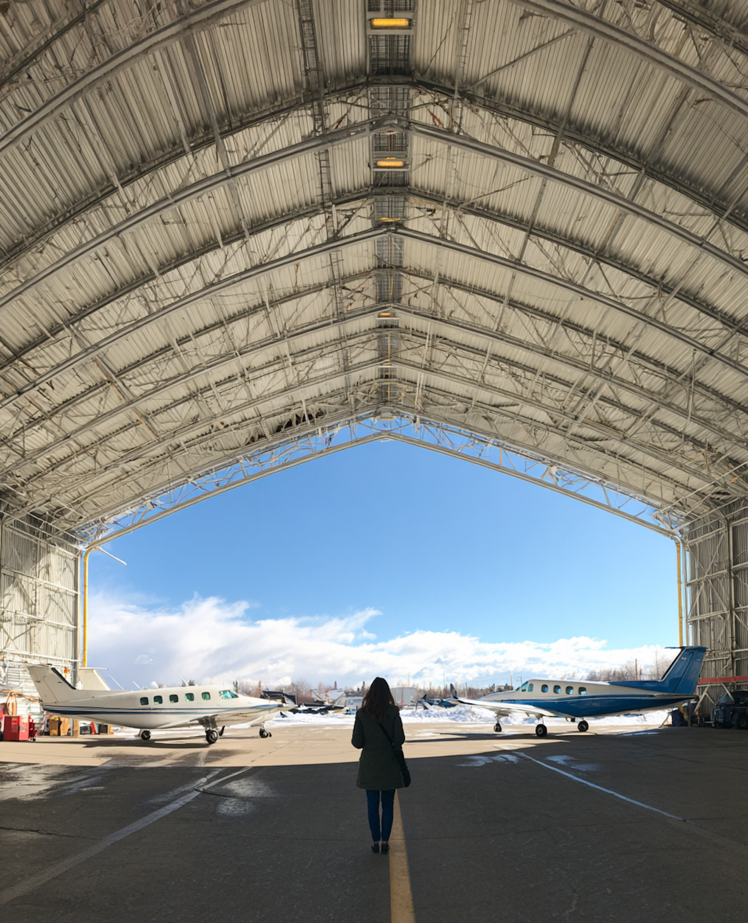 A person standing in a hangar entrance, viewing two small aircraft against a clear blue sky and sunny tarmac.