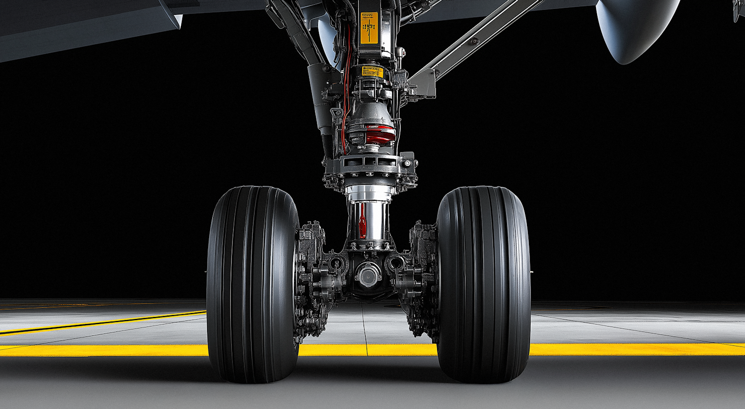 Detailed close-up of an aircraft's landing gear with dual wheels, hydraulic components, and a runway backdrop. Perfect for aviation enthusiasts.