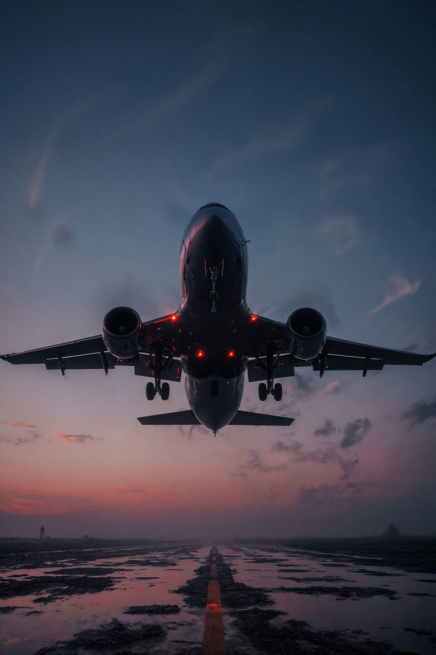 A dramatic view of an airplane landing at dusk, with glowing lights and a reflective runway under a colorful twilight sky.