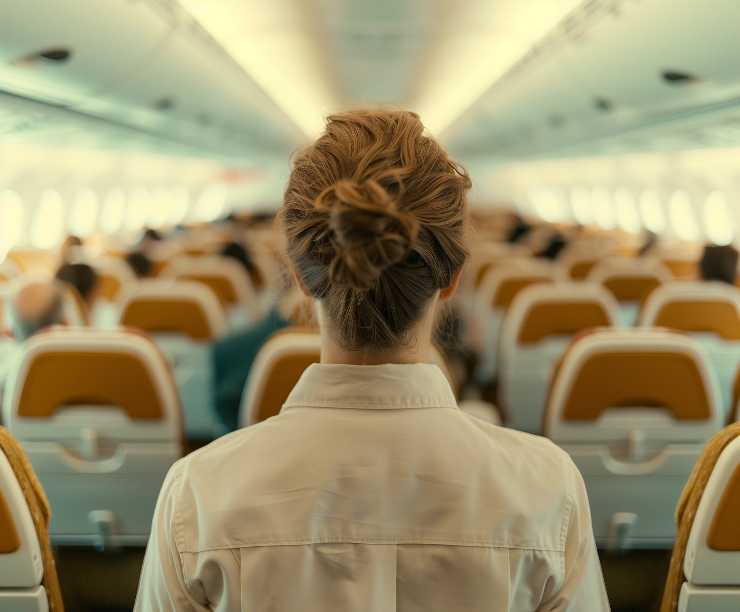Woman with bun seated in airplane cabin, wearing white shirt. Warm lighting and yellow headrests create a cozy atmosphere.