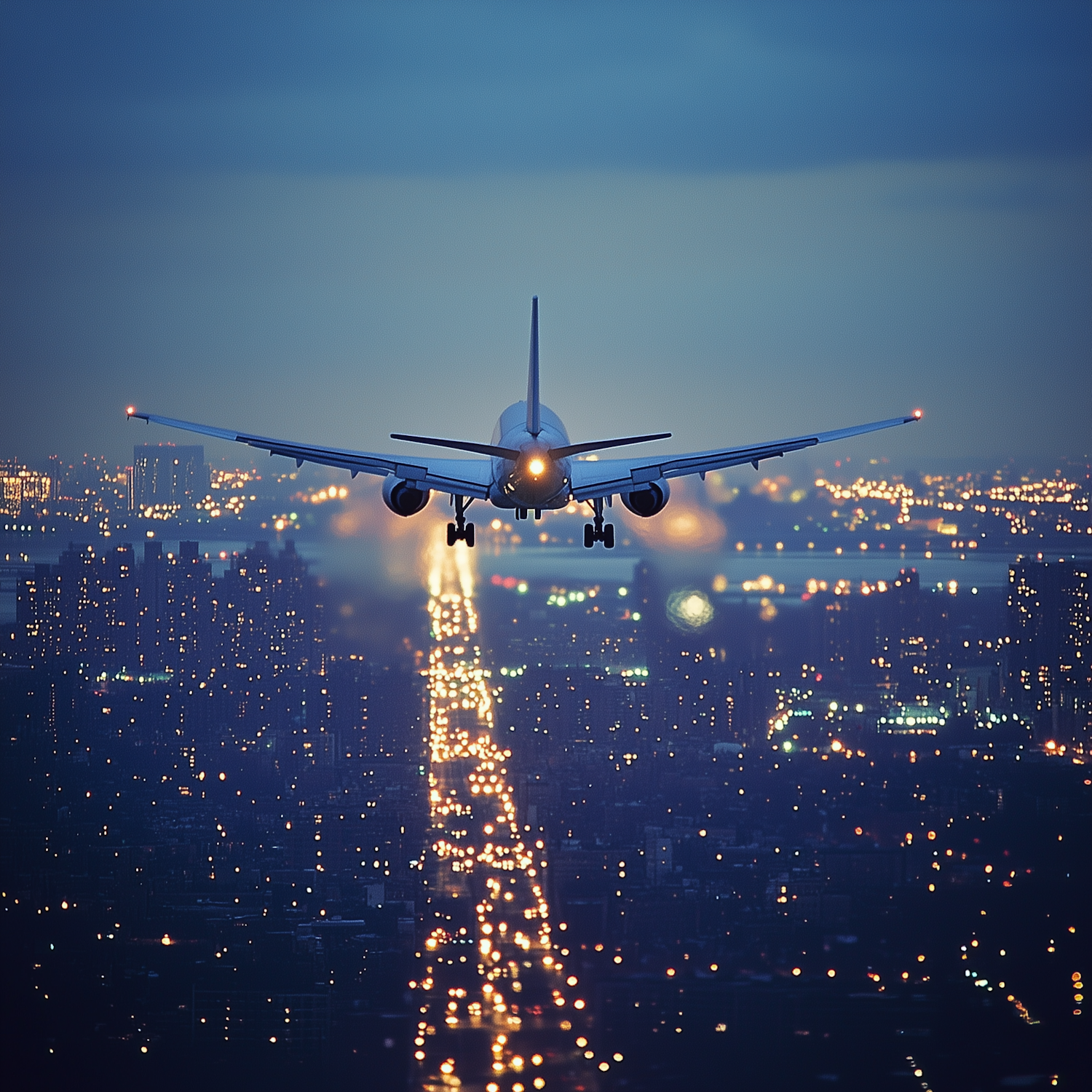 A plane descends over a glowing cityscape at twilight, aligned with a runway illuminated by bright lights. Stunning urban and aviation view.