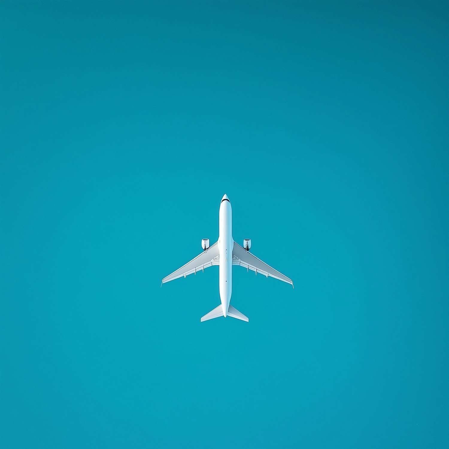 A white airplane flying against a vibrant blue sky, captured from above, showcasing its sleek design and symmetry.