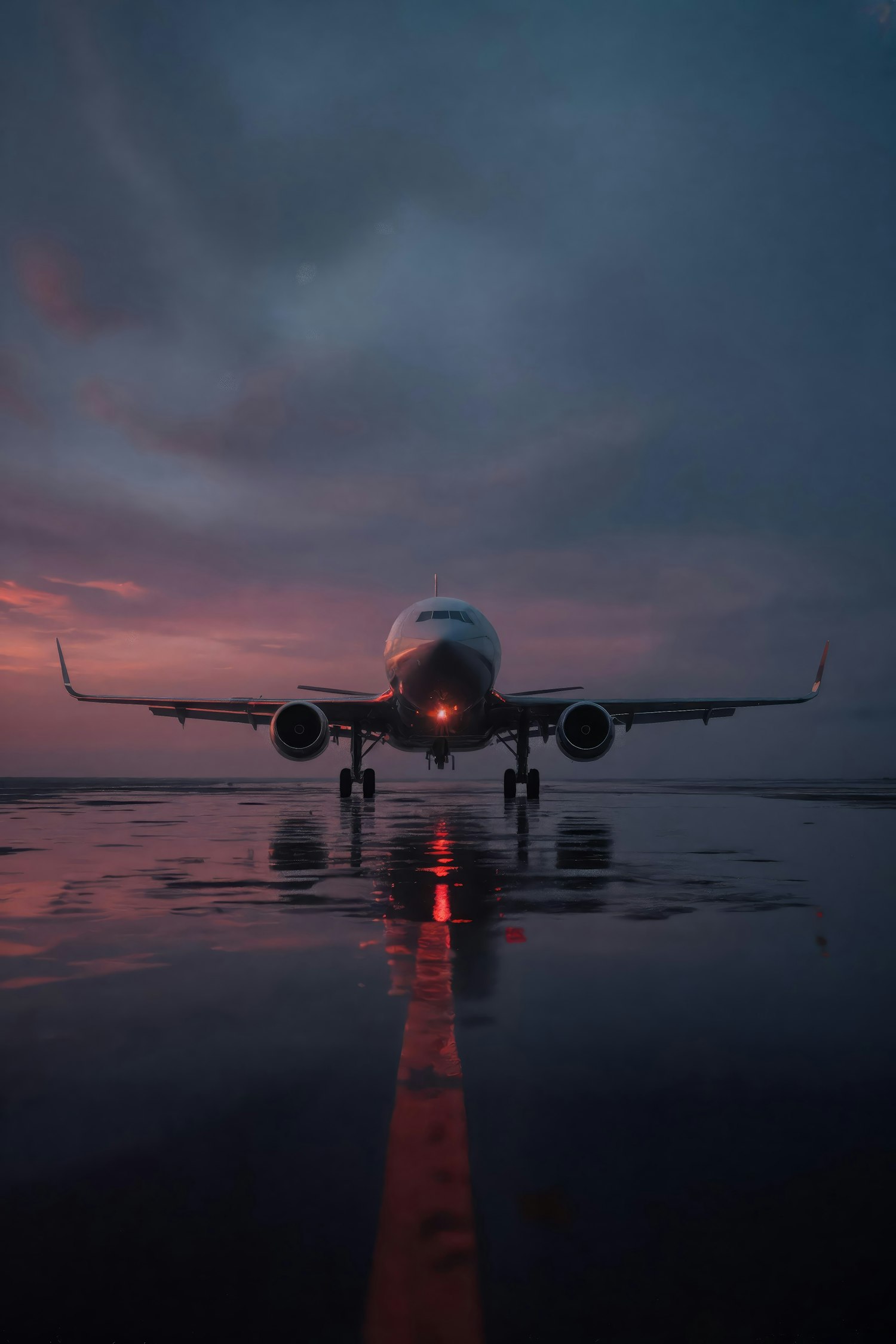 A commercial airplane on a wet runway at twilight, with its lights reflecting on the ground and a dramatic, colorful sky in the background.