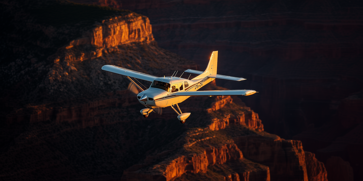 A small white airplane soars over a sunlit canyon, with rugged cliffs and golden light creating a breathtaking aerial scene.