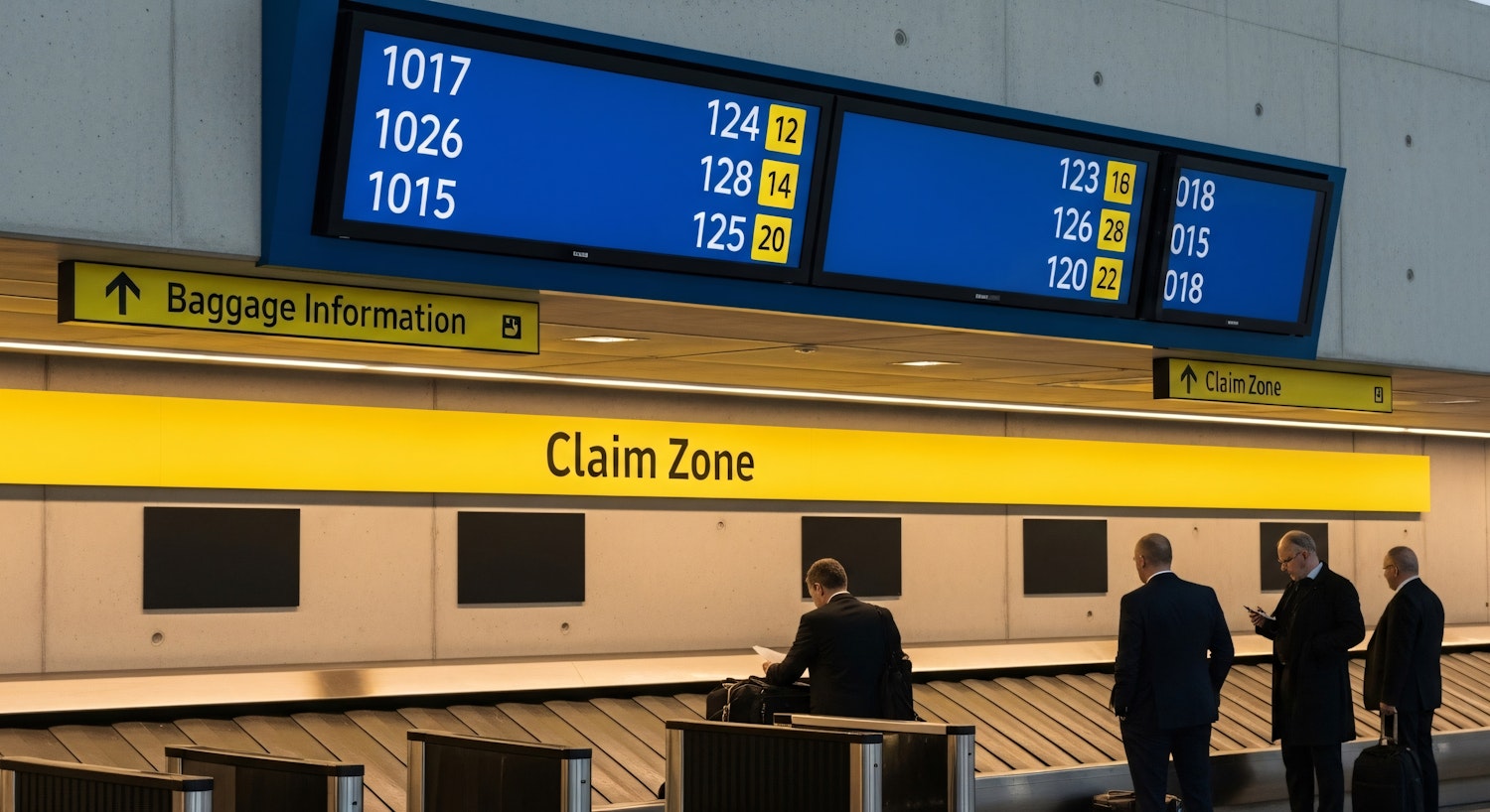 Airport baggage claim area with digital flight information screens and business travelers waiting for their luggage.