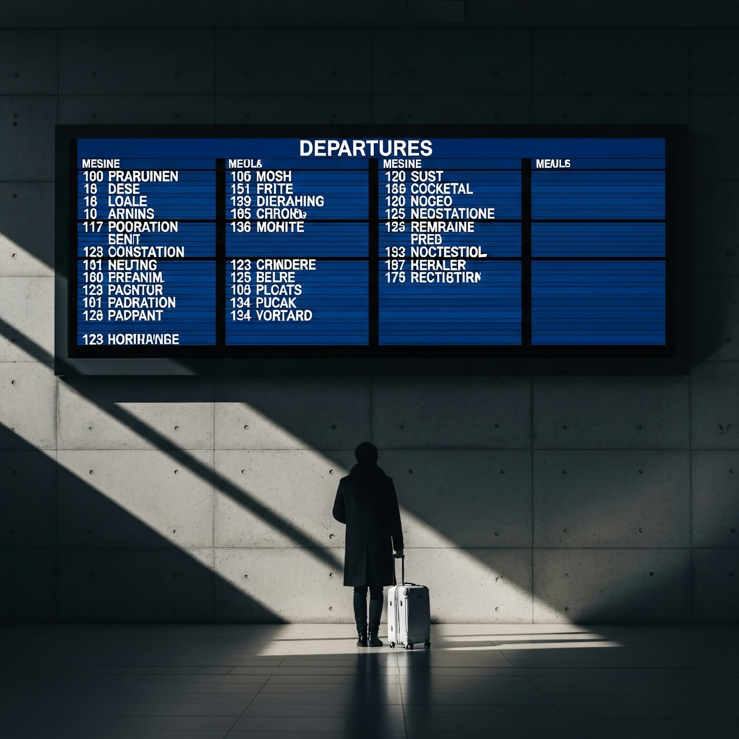 A traveler with a suitcase stands before a departures board in a modern airport terminal, illuminated by dramatic light and shadows.