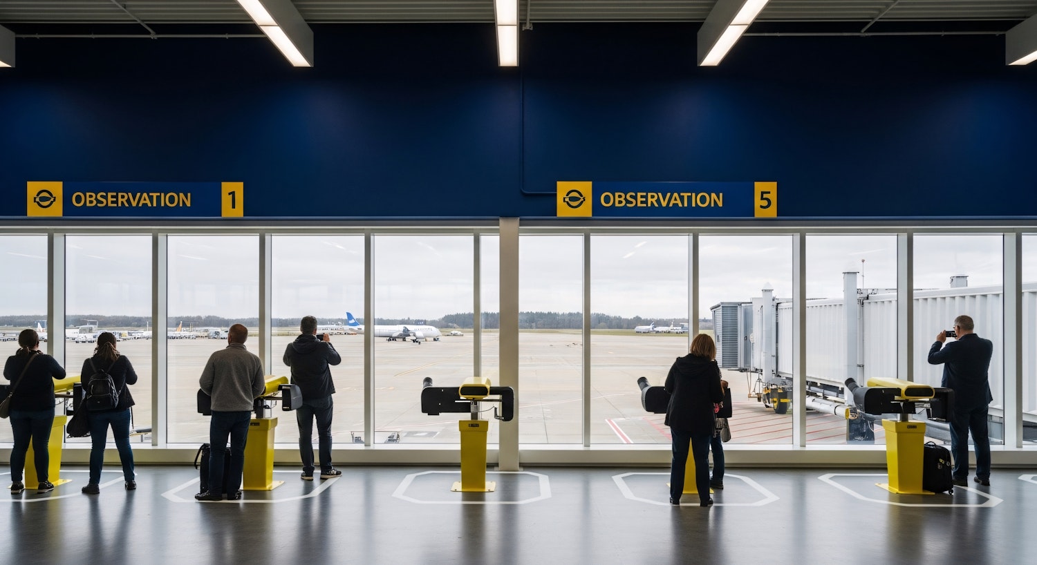People at an airport observation deck watching planes through large windows, with yellow binocular stands and a clear view of the runway.
