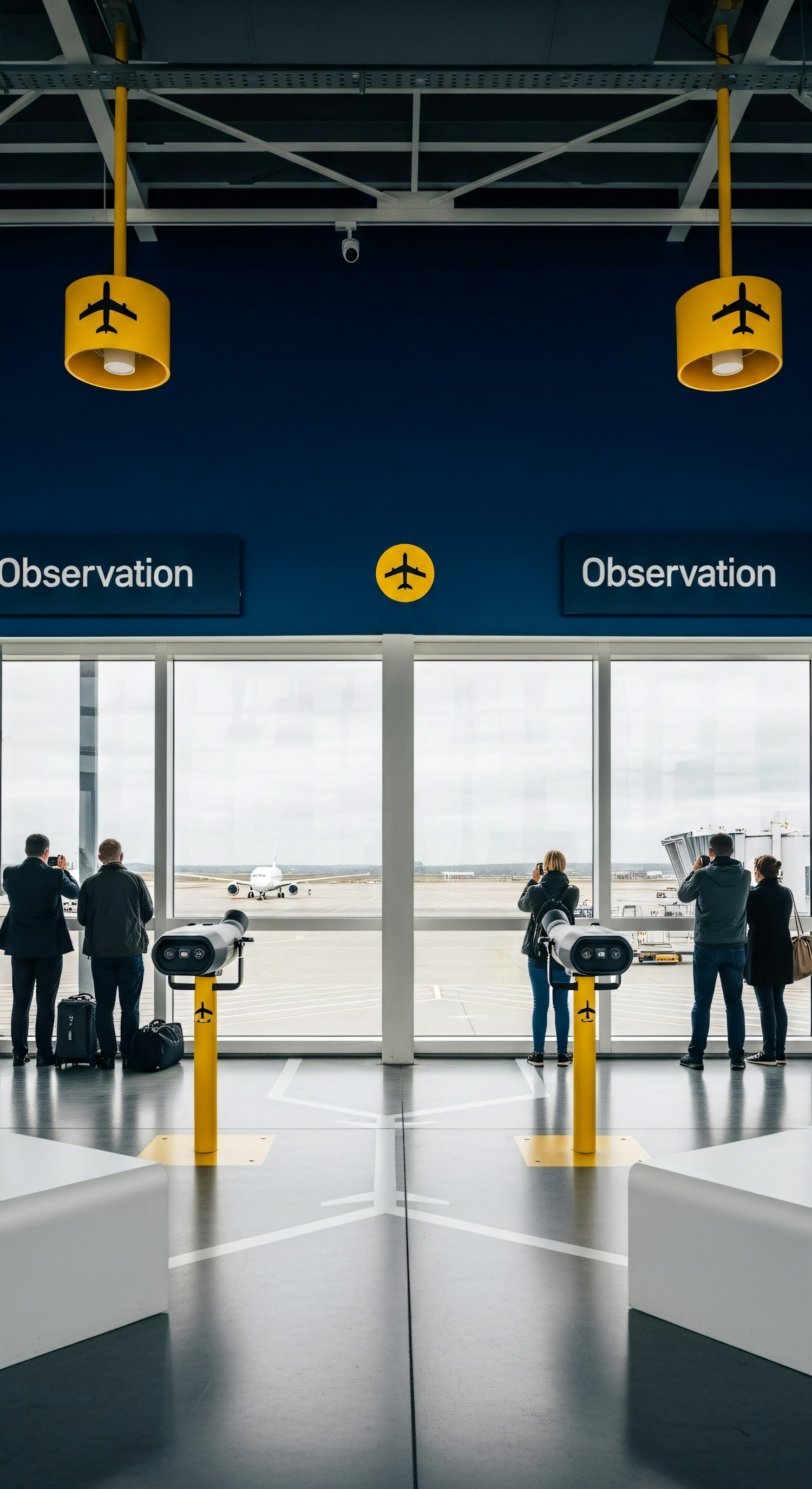 Modern airport observation deck with large windows, yellow airplane-themed decor, and people watching planes on the tarmac.