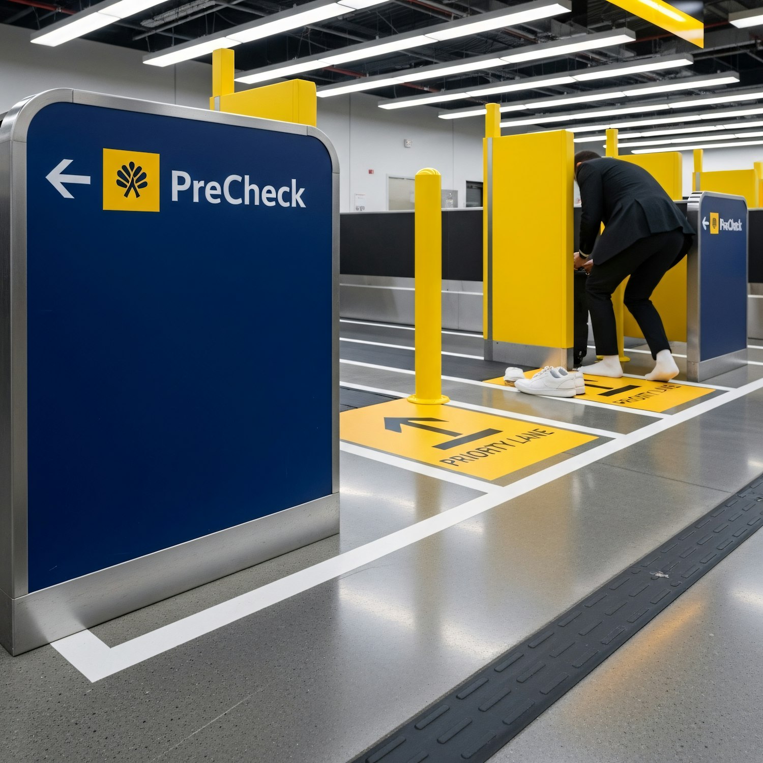Modern airport PreCheck lane with clear signage and a traveler preparing for security screening in a clean, organized environment.