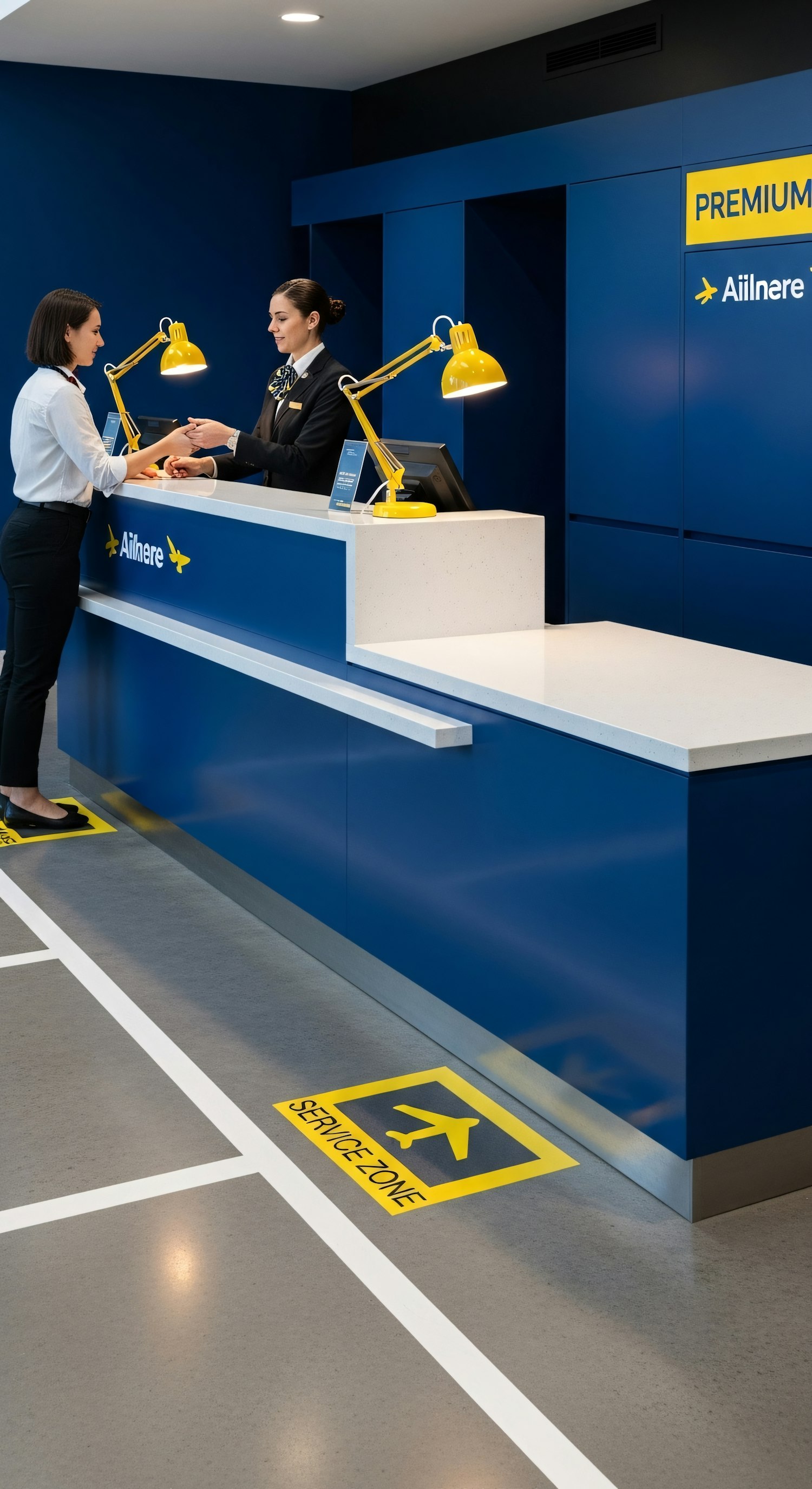 Modern airport service counter with blue and yellow design, featuring a staff member assisting a customer in a clean, professional setting.