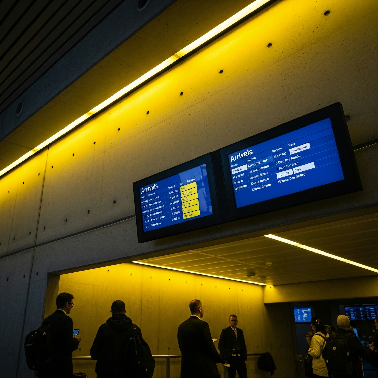 Travelers gather under yellow lighting in an airport terminal, checking flight arrival information displayed on digital screens.