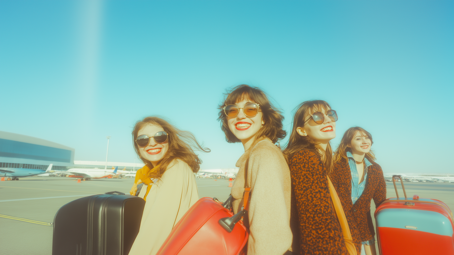 Four friends with colorful luggage smile under a sunny sky at an airport, ready for their travel adventure.
