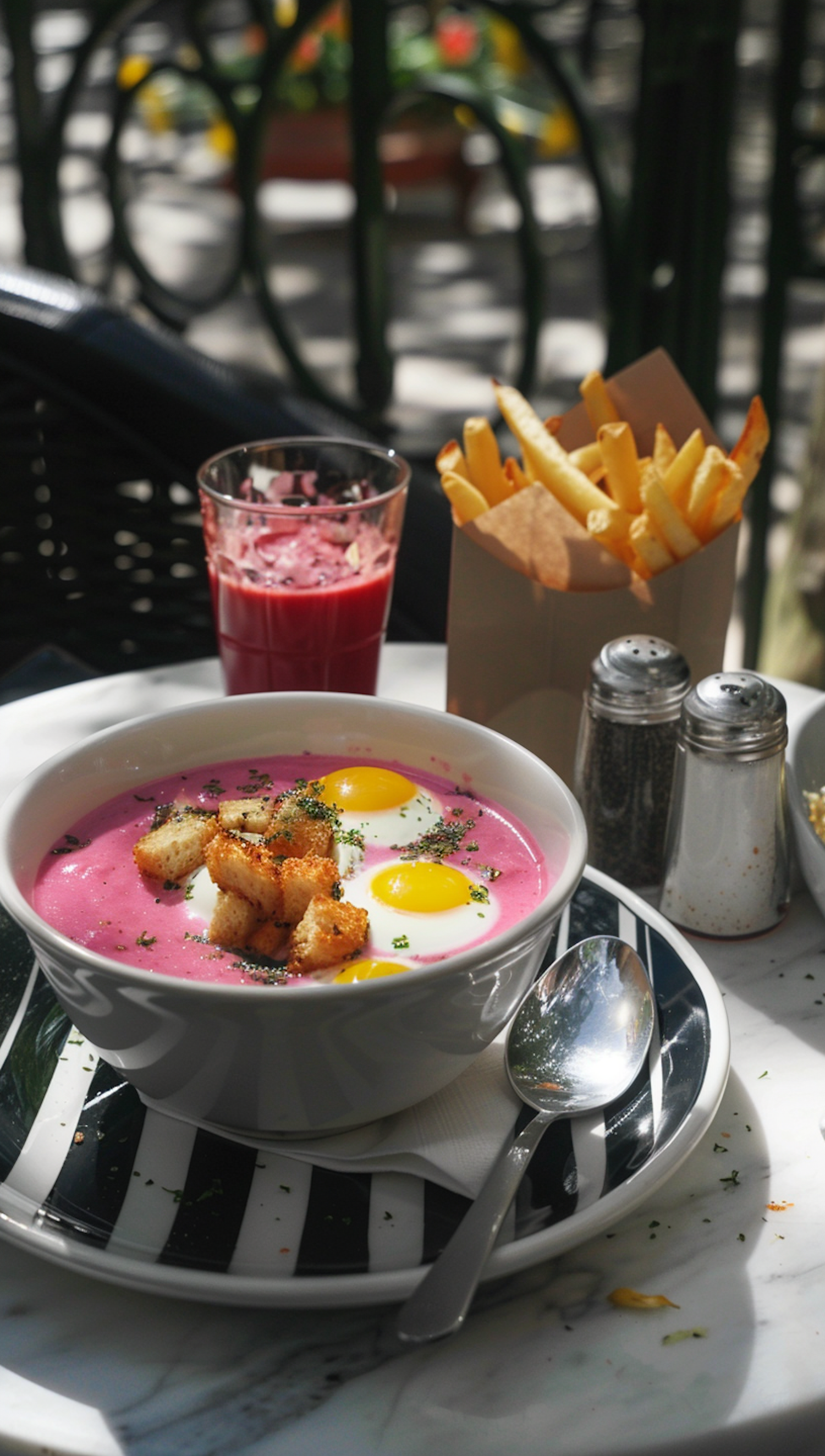 Colorful pink soup with eggs and croutons, served with fries and juice on a marble table. A vibrant and appetizing meal.