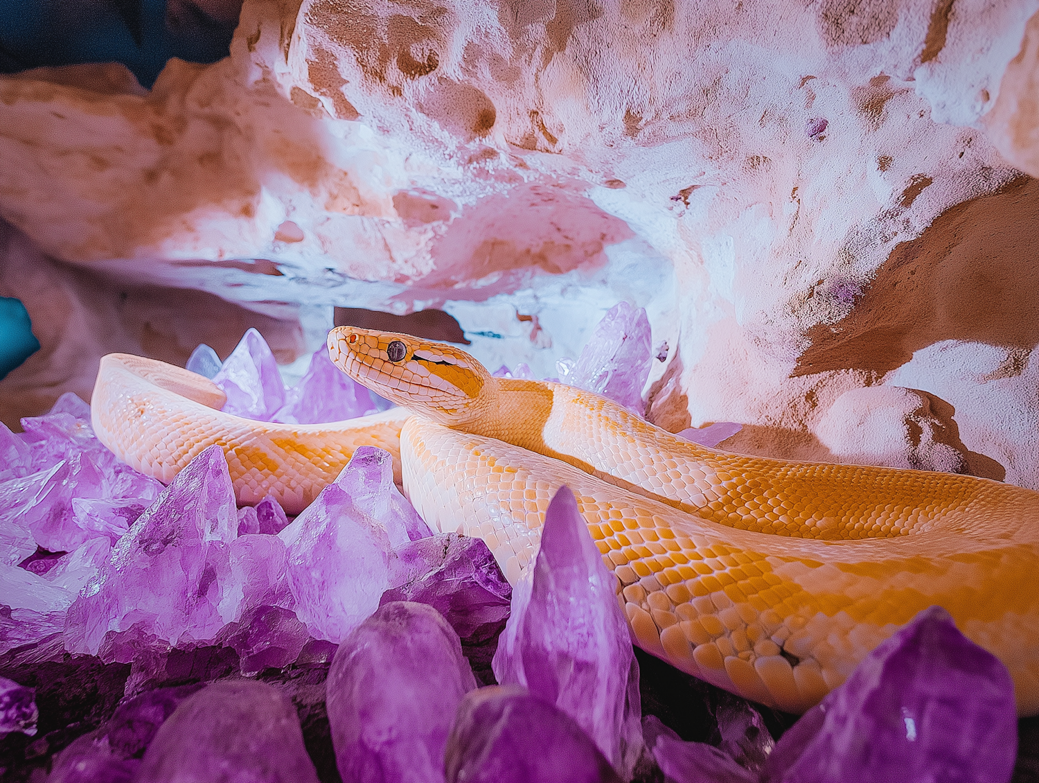 Albino Snake Amidst Amethyst Crystals
