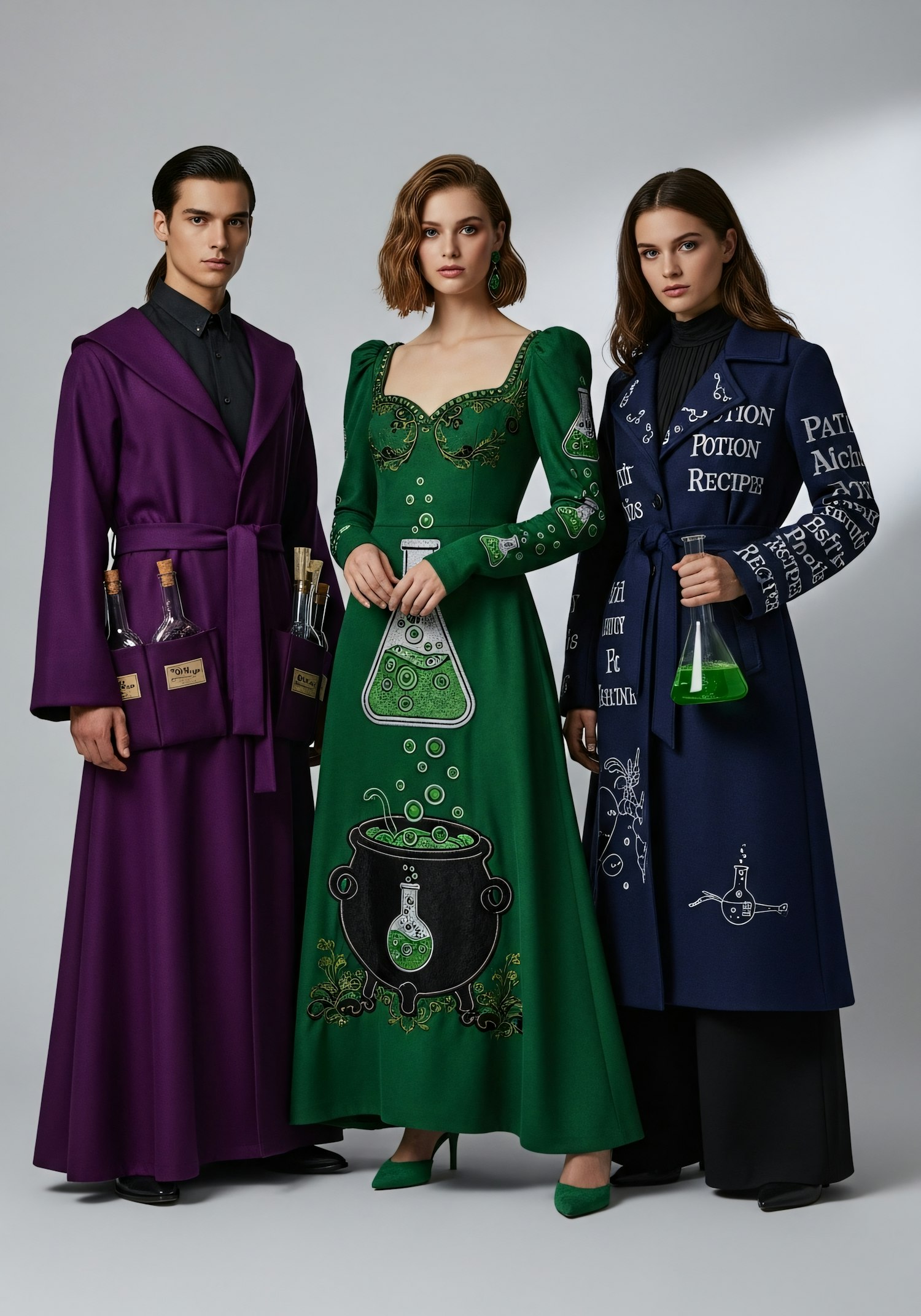Three individuals in vibrant, alchemy-inspired outfits, featuring intricate designs and props, set against a neutral background.
