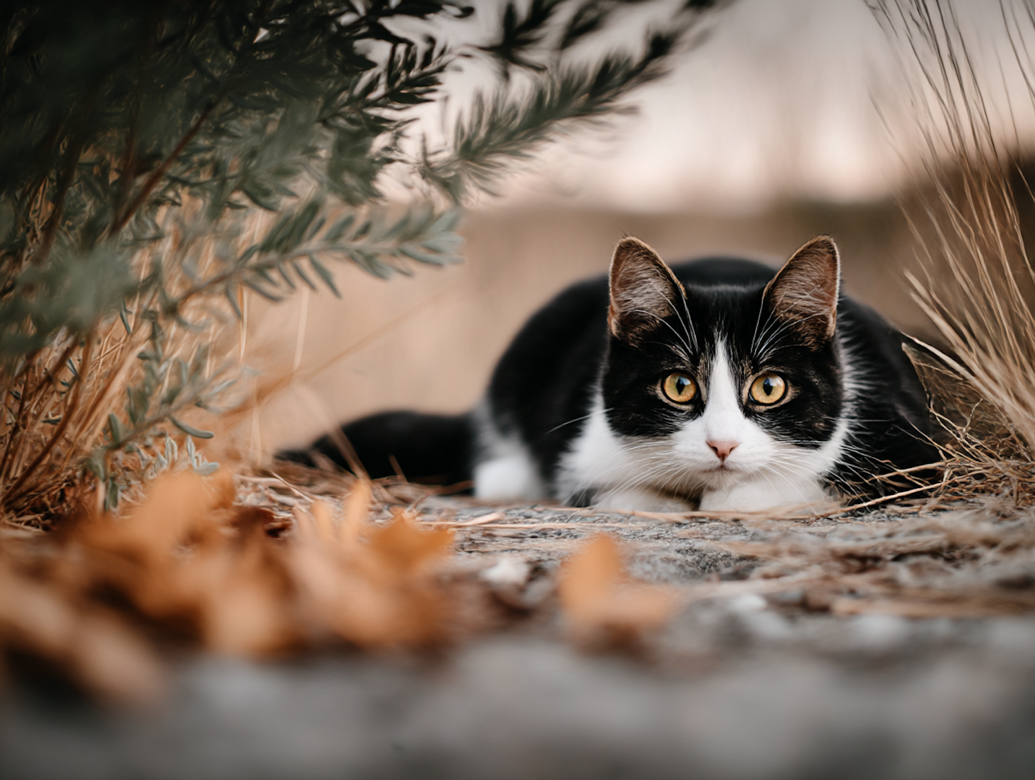 A black-and-white cat with yellow eyes lies in dry grass, surrounded by autumn leaves and greenery, looking alert and curious.