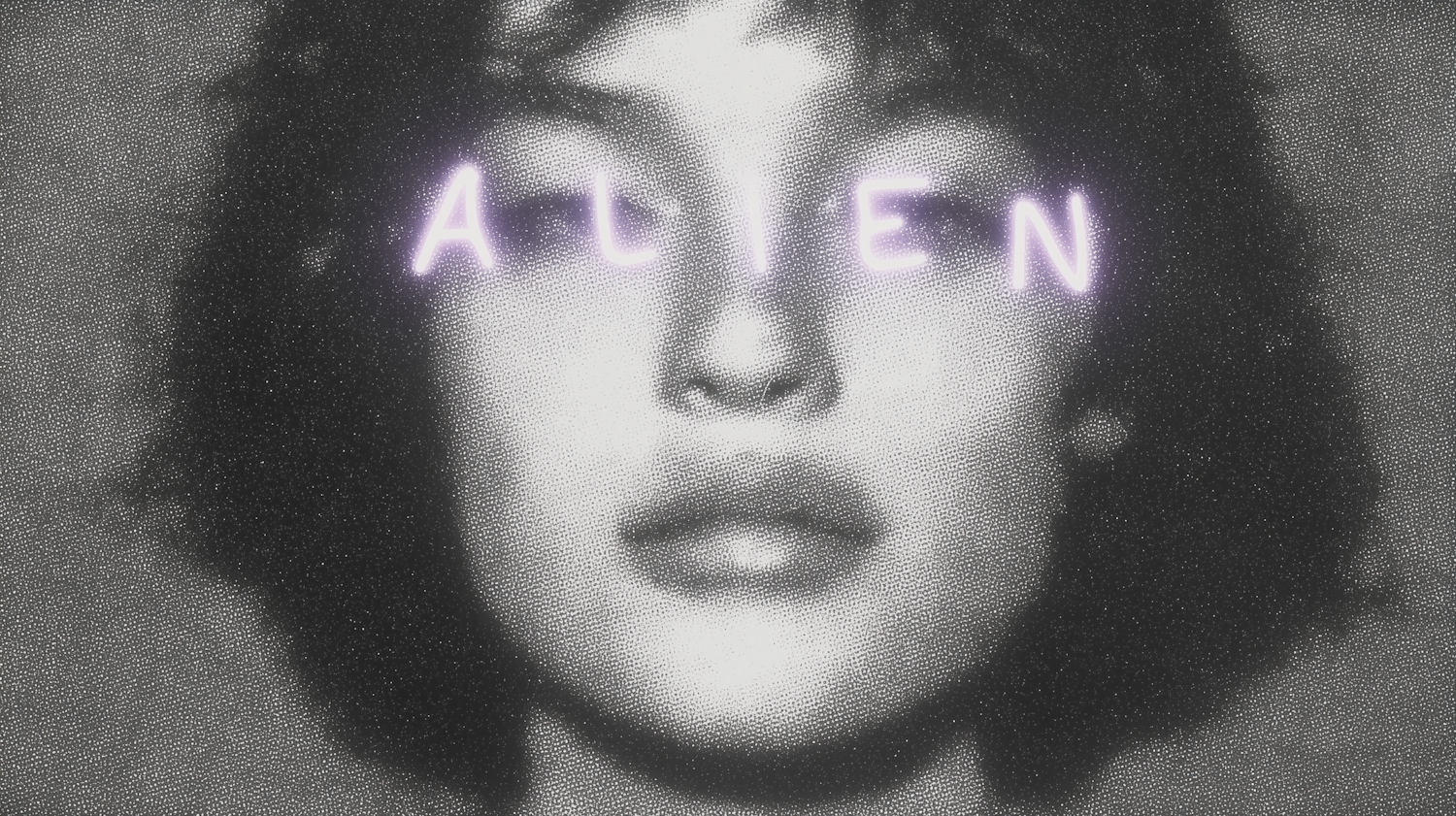 Grainy monochrome portrait with glowing 'ALIEN' text across the eyes, creating a surreal and mysterious vibe.