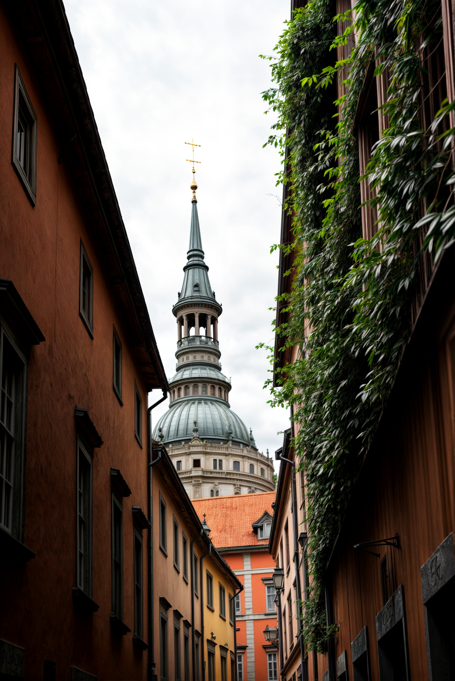 Narrow alley with colorful buildings leading to a grand dome with a spire, topped with a golden cross, under a cloudy sky.