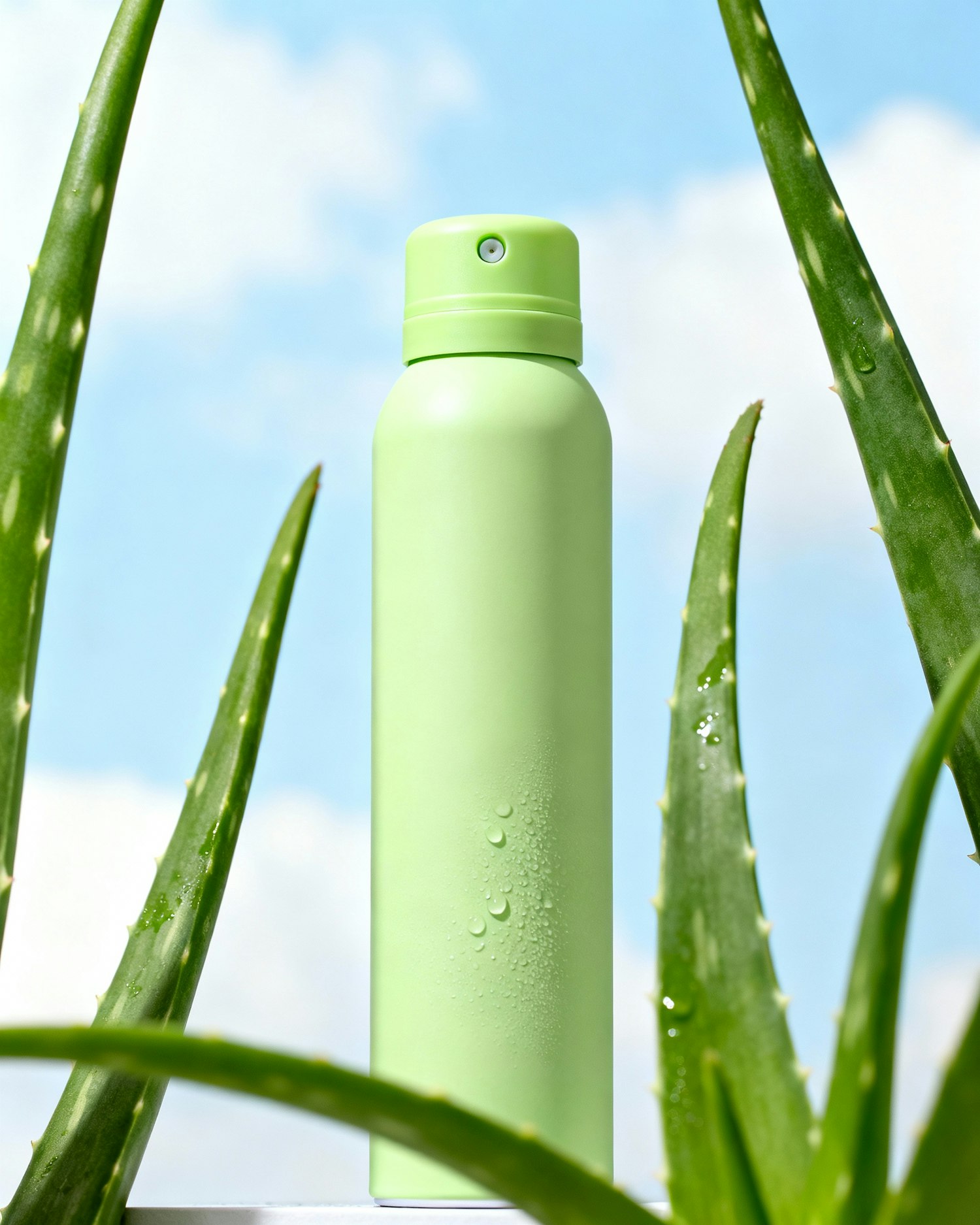 ultra-realistic studio product photography, clean lighting, soft natural reflections, accurate textures, subtle shadows, premium editorial style, no labels, no logos, no distortion. aerosol deodorant in lime green with a soft matte finish, smooth seamless cylinder, same color from body to cap, minimal rounded plastic cap, small integrated press-button diffuser, modern clean silhouette, no metallic shine, no gloss, no reflective aluminum texture. background bright sky with soft clouds, aloe vera leaves framing the product, subtle droplets.