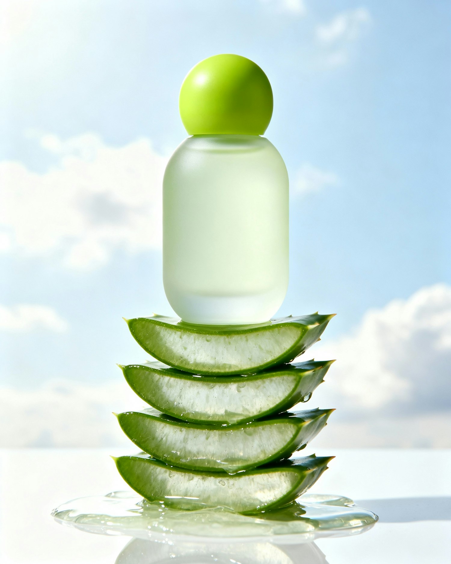 A frosted bottle with a green cap sits on aloe vera slices, set against a bright sky, evoking freshness and natural purity.