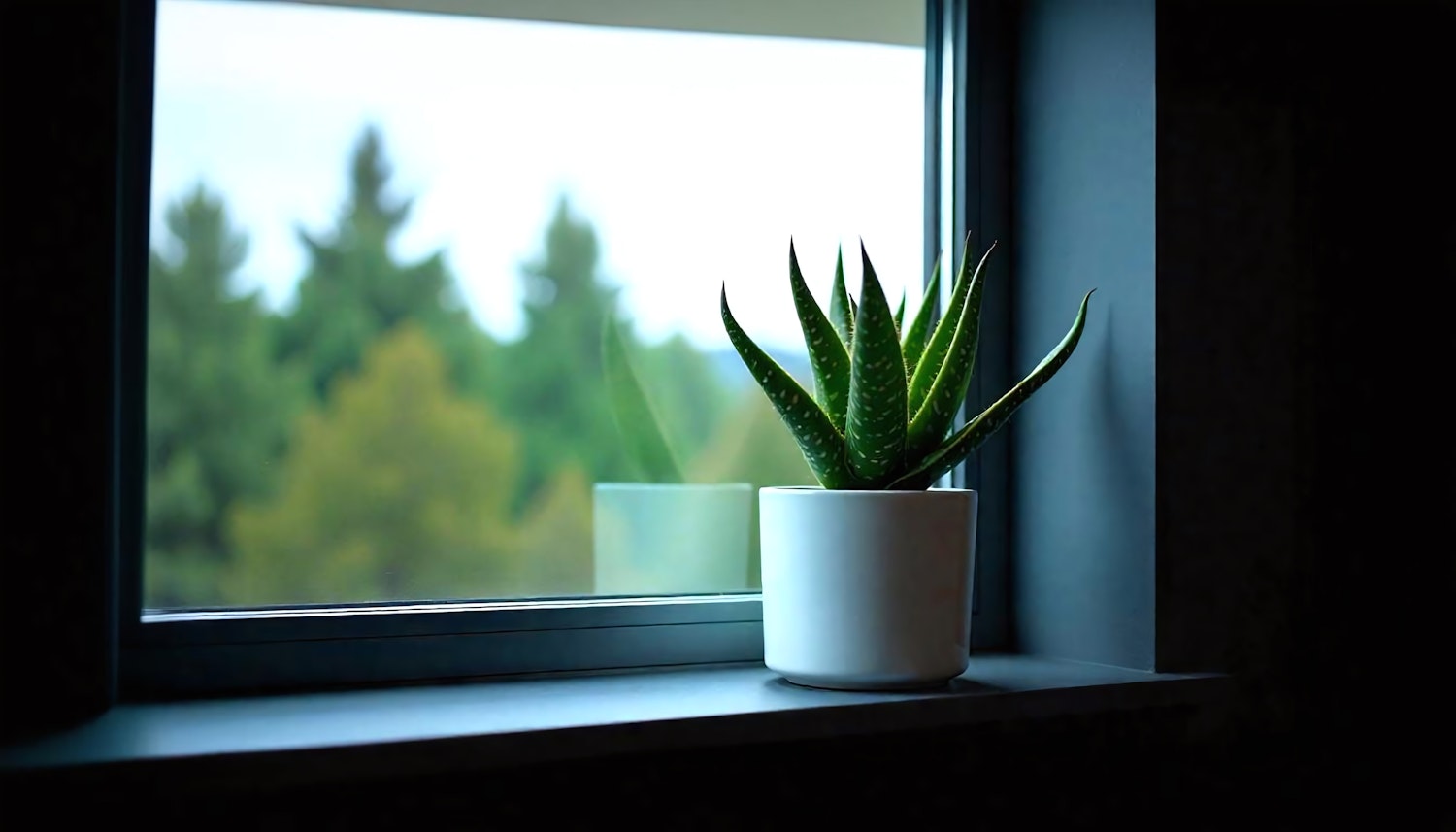 Aloe vera plant in a white pot on a windowsill with blurred green trees outside, creating a serene and minimalistic scene.