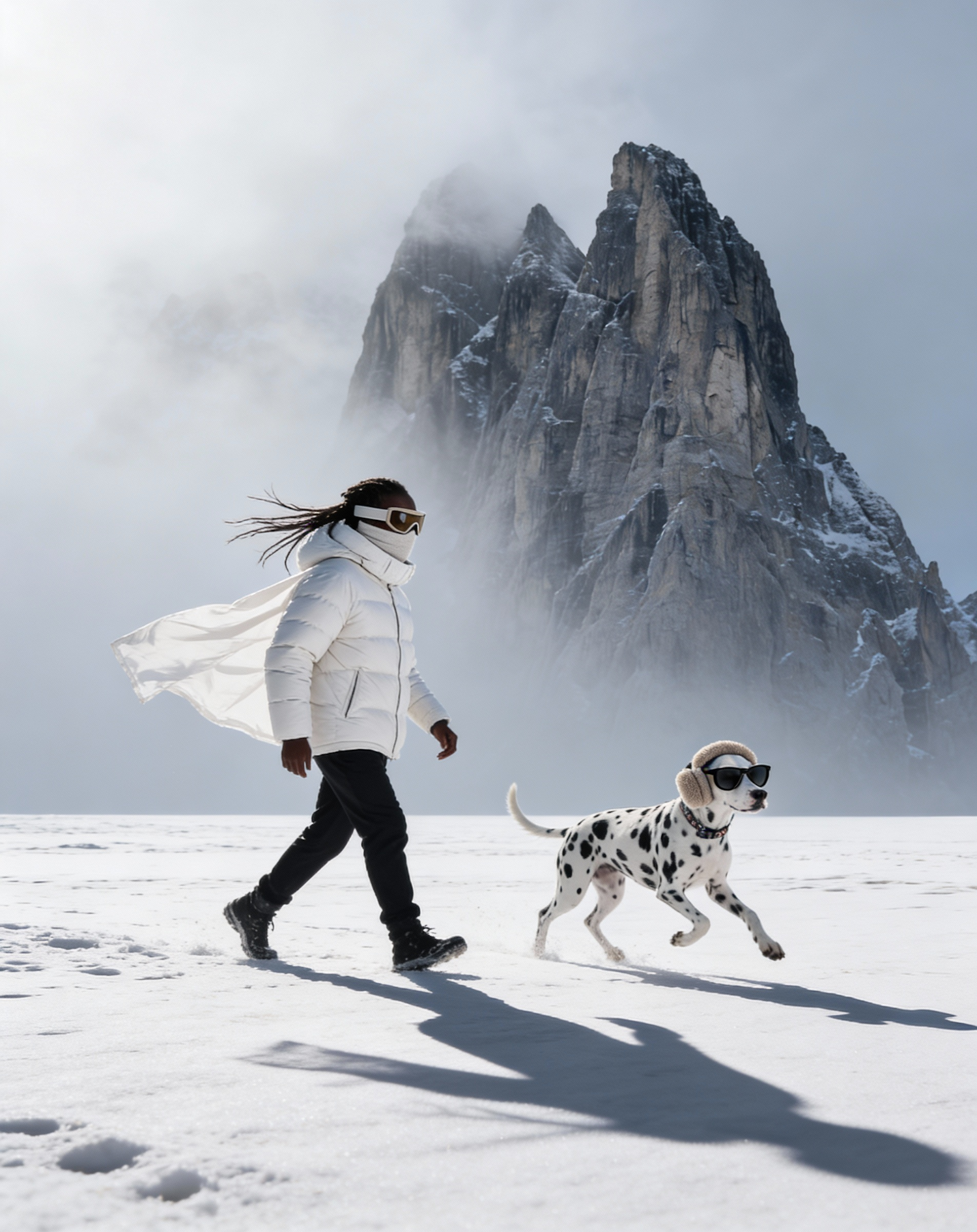 A person and a Dalmatian dog, both stylishly dressed for winter, walk on a snowy plain with majestic mountains in the background.