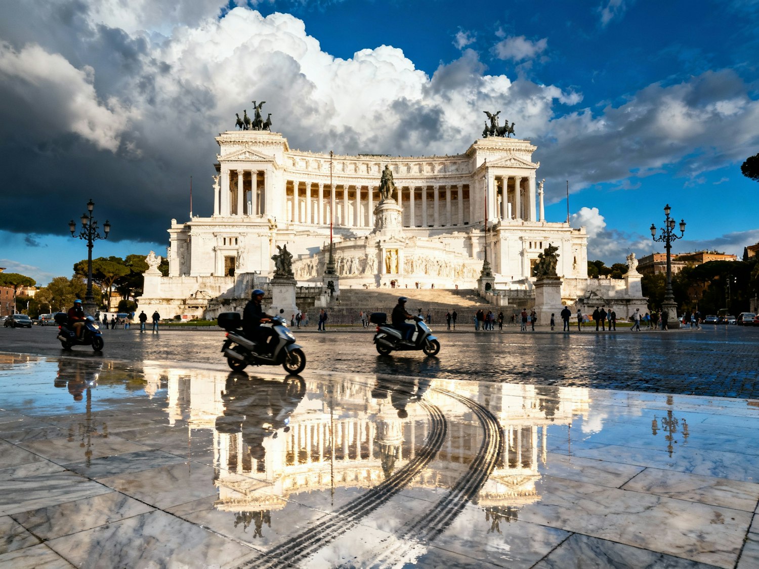 A stunning view of the Altare della Patria in Rome, with dramatic clouds and reflections on wet marble, capturing the city's vibrant atmosphere.
