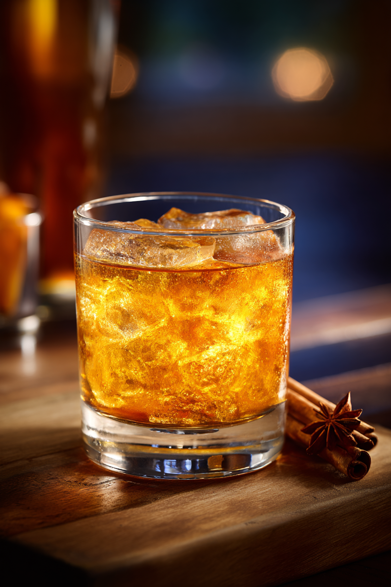 A glass of iced amber drink with cinnamon and star anise garnish on a wooden table, set against a warm, softly lit background.
