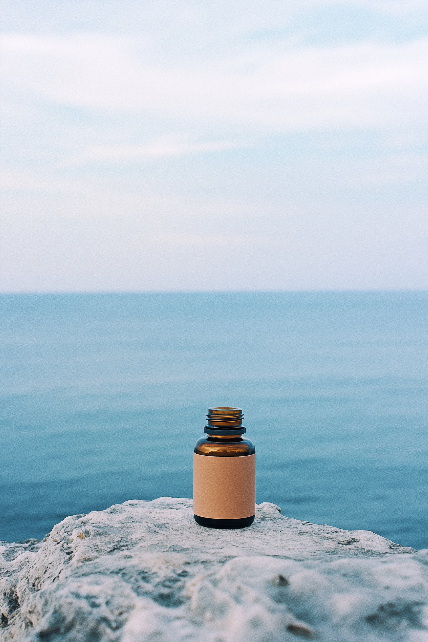Minimalist amber glass bottle on a white rock with a serene ocean and pastel sky in the background. Perfect for wellness or skincare themes.