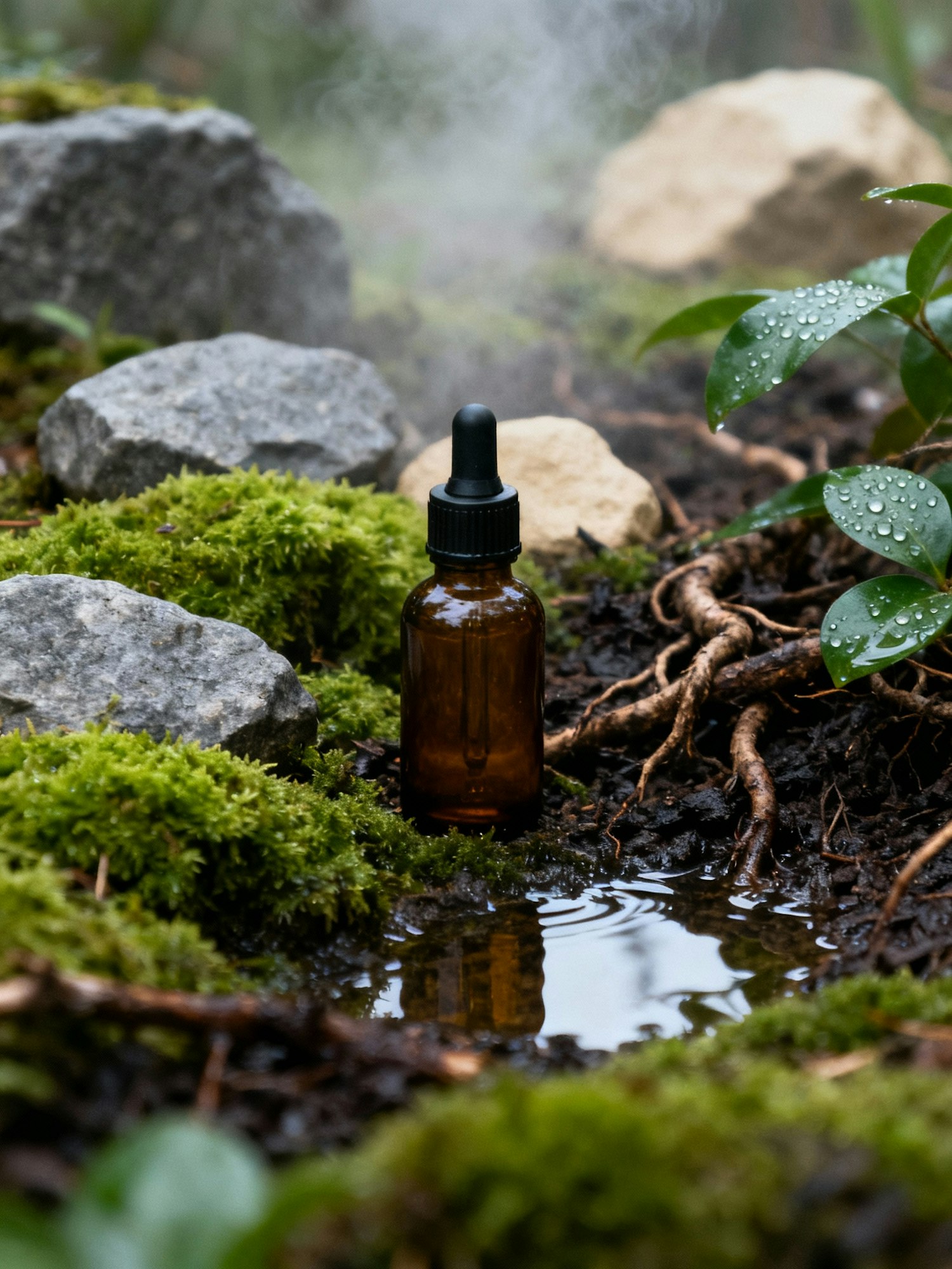 Amber dropper bottle in a lush, mossy setting with rocks, water droplets, and mist, evoking a natural and serene atmosphere.