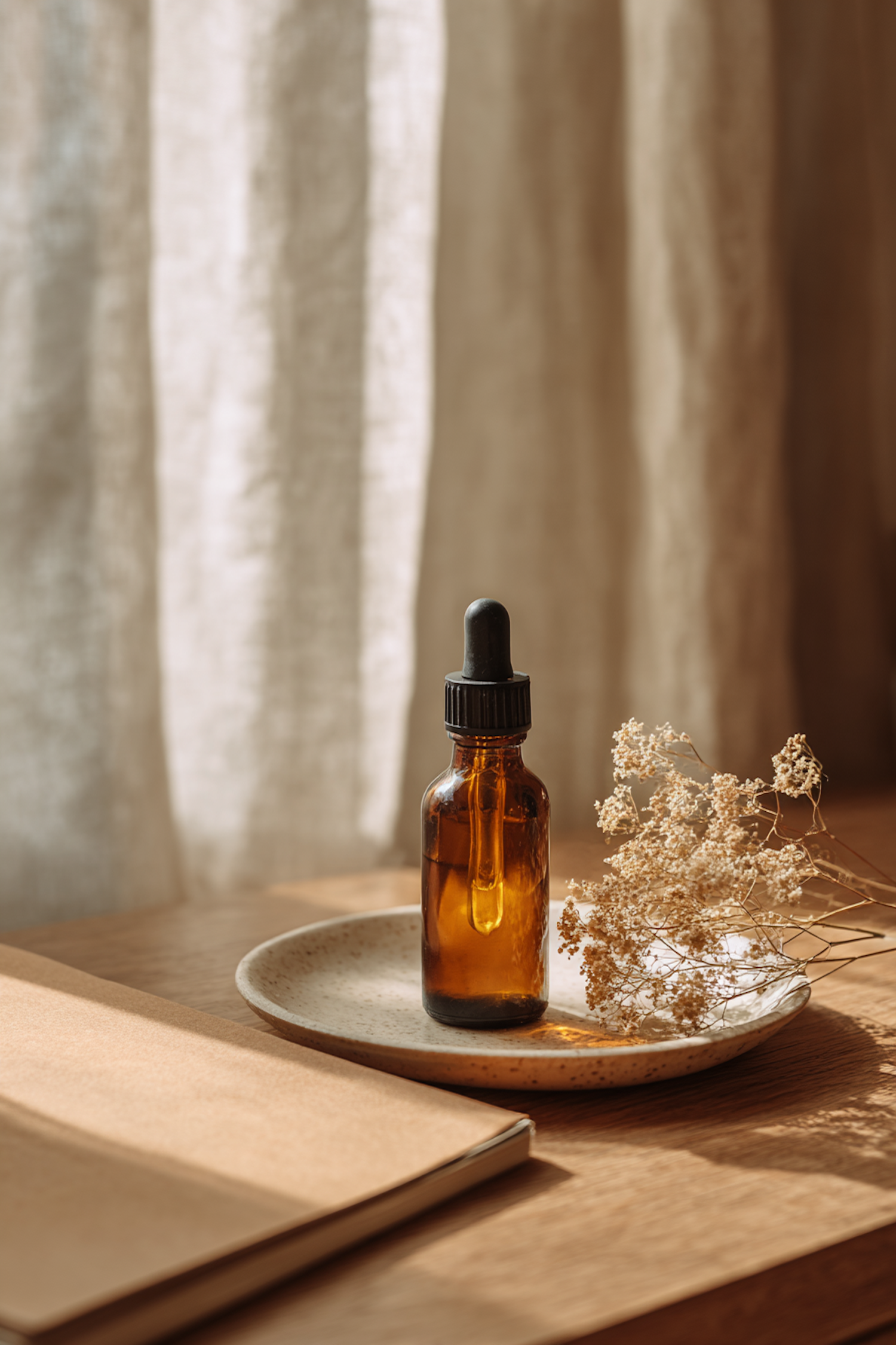 Amber dropper bottle on a ceramic plate with dried flowers, set on a wooden table in soft natural light for a serene, minimalist vibe.
