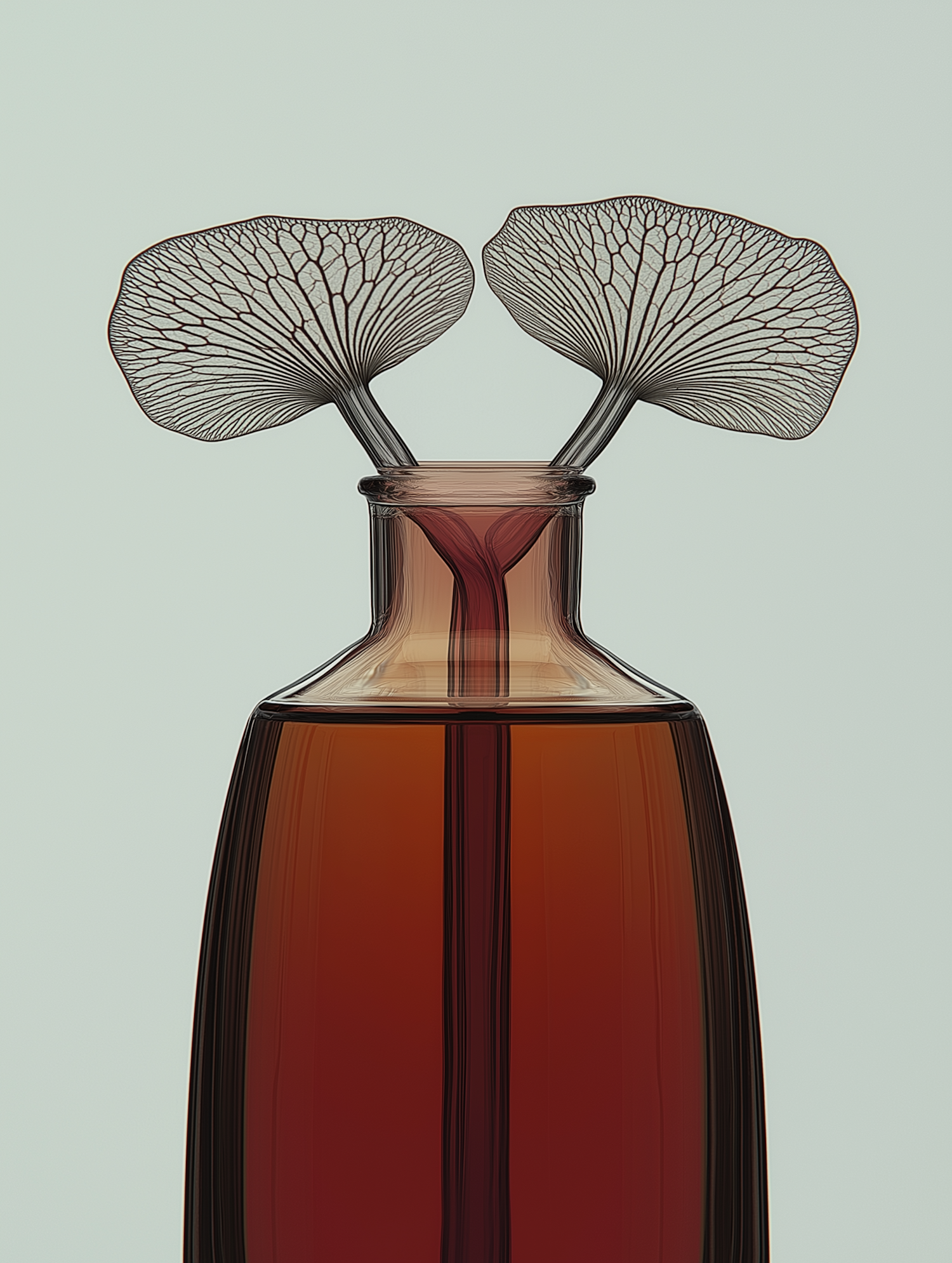 Elegant glass bottle with intricate leaf-like structures against a soft green background, showcasing minimalist design and rich amber hues.