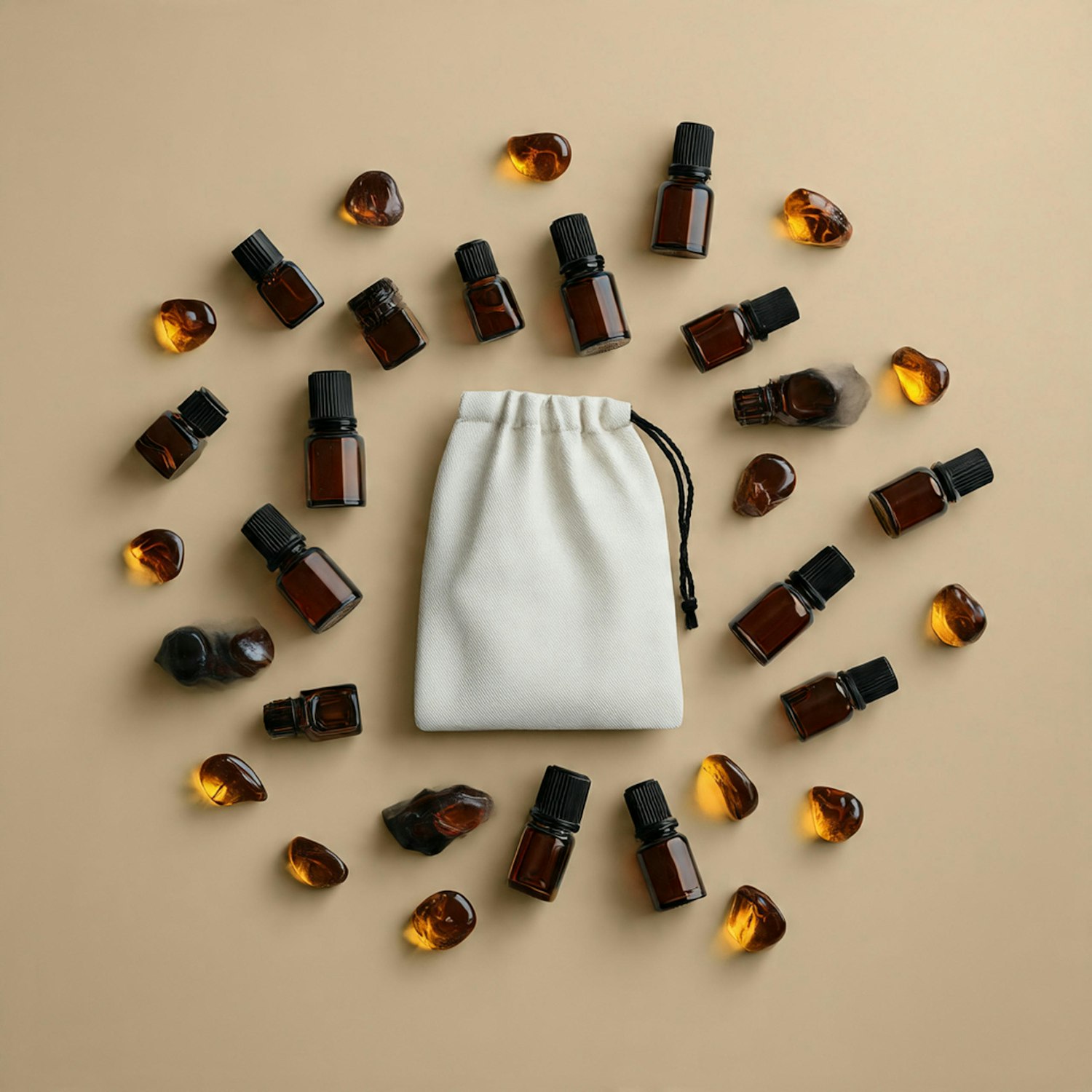 Amber glass bottles and polished stones arranged around a white pouch on a beige background, creating a natural and balanced aesthetic.