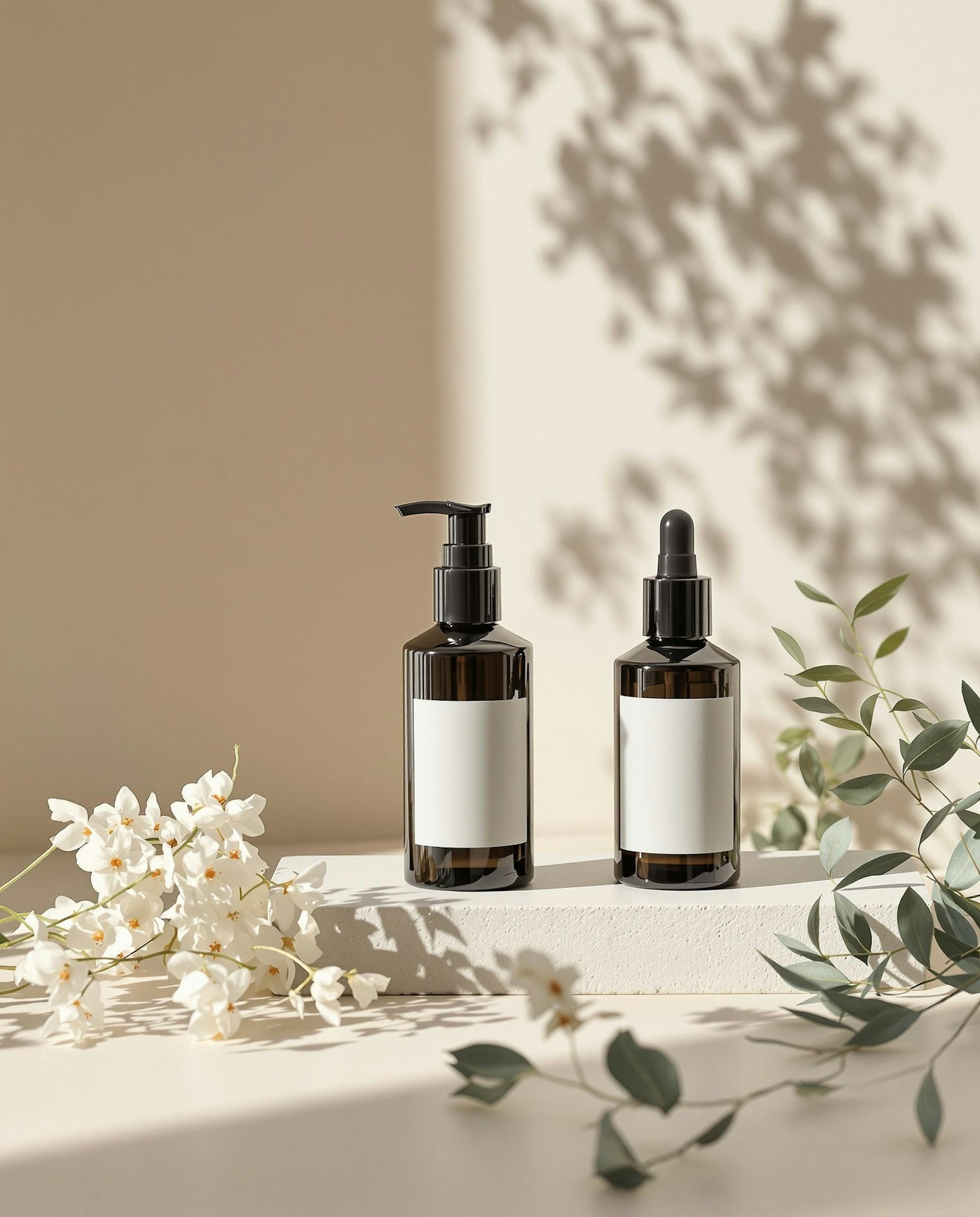 A minimalist luxury skincare scene with soft, cold daylight. Two dark glass pump bottles on a light stone surface. Background in desaturated beige or pale grey with cool undertones. Natural light casts soft but defined shadows. Styled with white flowers and cool green foliage. Calm, elegant, and crisp atmosphere.