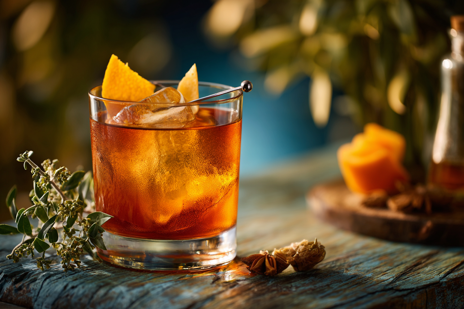 A refreshing amber cocktail with orange peel garnish, served on ice, surrounded by herbs and spices on a rustic wooden table.