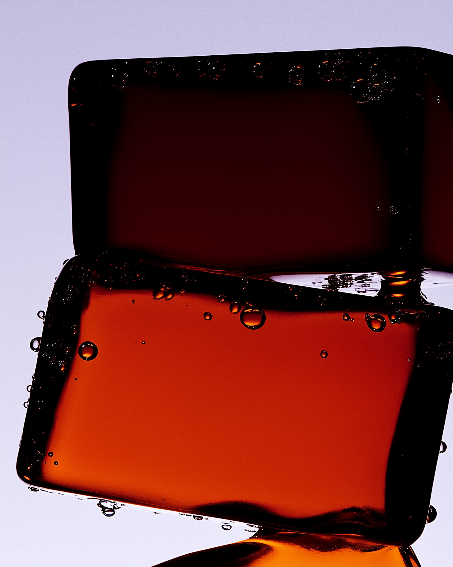 Close-up of two translucent amber blocks with air bubbles, stacked at an angle against a light gradient background.