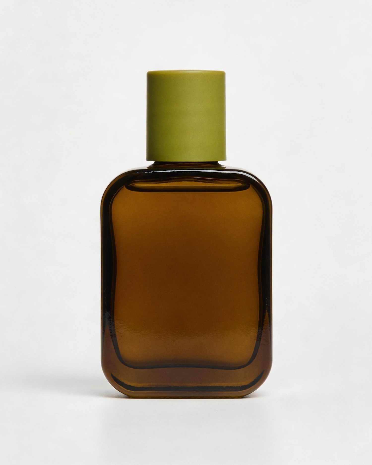 Dark amber glass bottle with smooth rounded rectangular shape, matte faded lime green cylindrical cap, pure white seamless background, clean isolated product shot, soft even studio lighting, no shadows, no reflections, no surface, centered composition, sharp focus on entire bottle, commercial product photography, high resolution