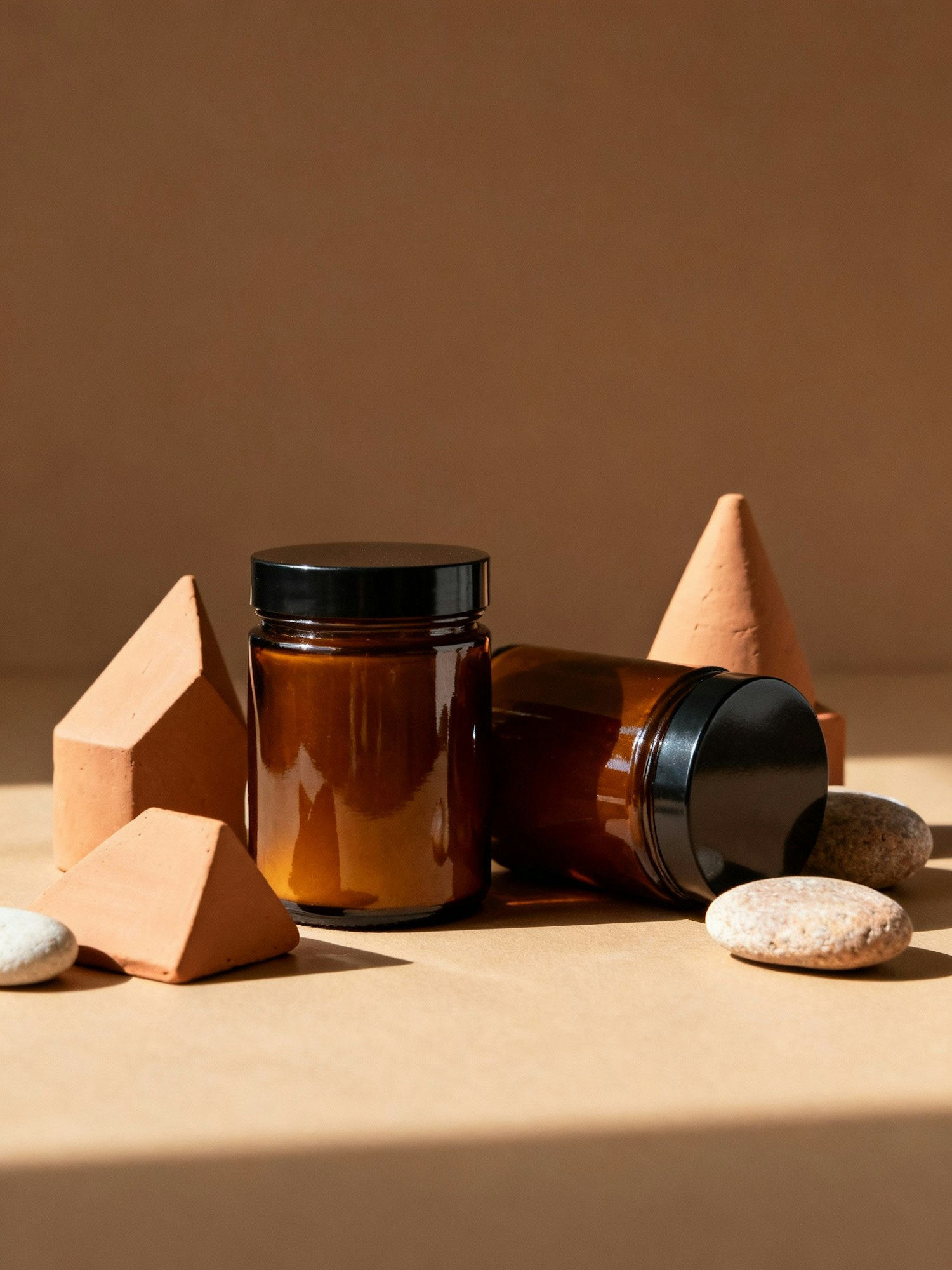 Amber glass jars with black lids surrounded by terracotta shapes and stones on a beige surface, creating a natural and minimalist aesthetic.