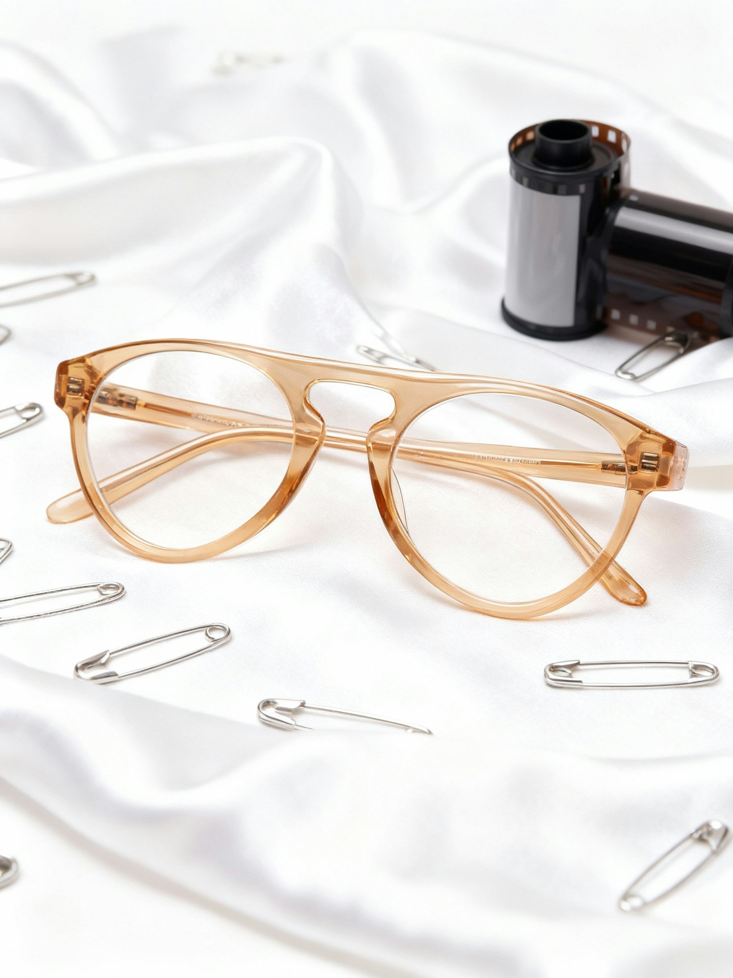 Amber eyeglasses on white satin with safety pins and a roll of film, blending modern style with nostalgic elements.
