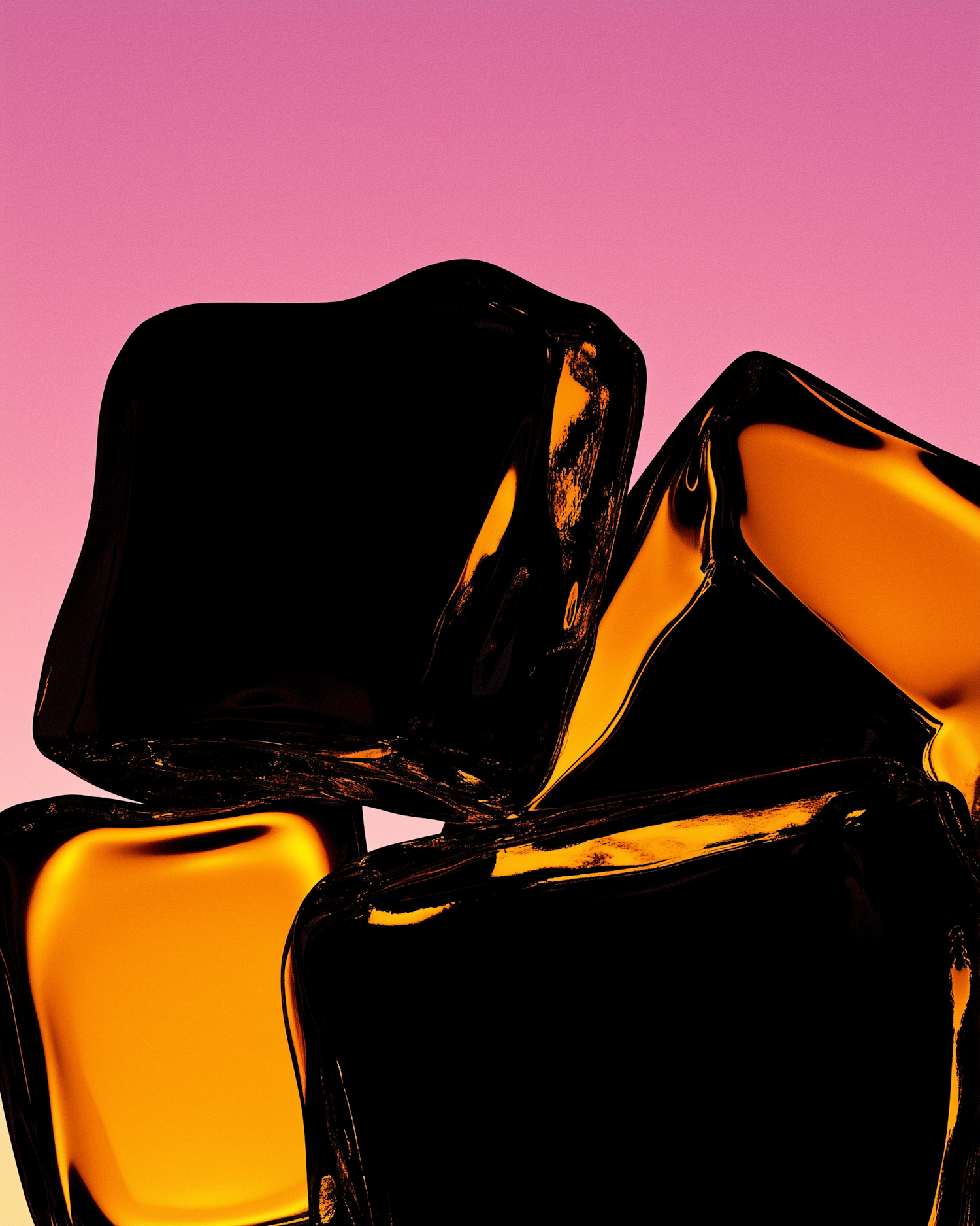 Glossy amber ice cubes stacked against a pink gradient background, creating a vibrant and modern aesthetic with glowing reflections.