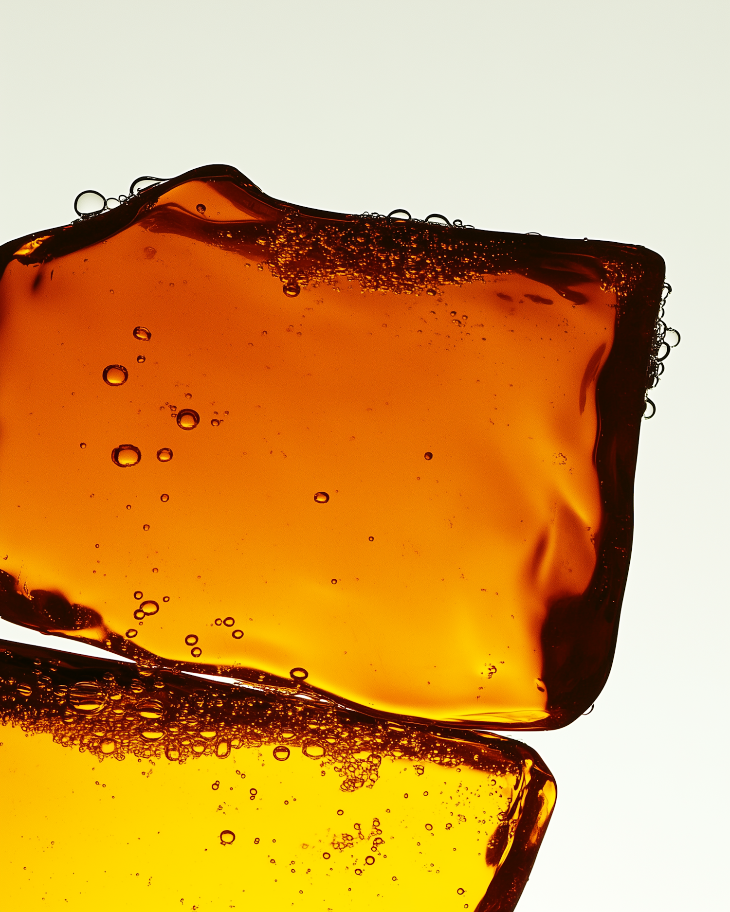 Close-up of two amber ice cubes with air bubbles, glowing against a light background. Perfect for beverage or artistic visuals.