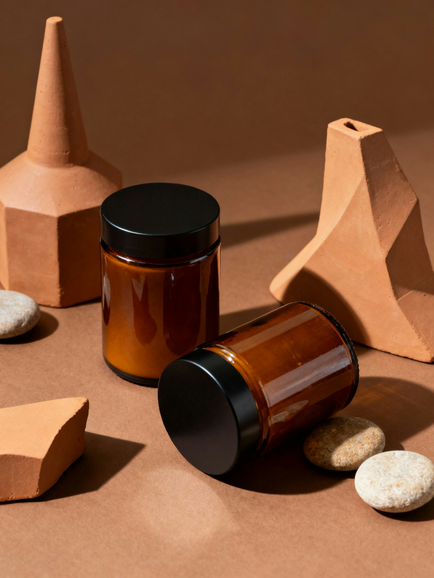 Studio product photography in a refined, sculptural, and organic art direction — matte amber glass packaging with a black lid, minimalist and label-free, placed against a warm brown studio background. The lighting is soft, directional, and diffused from one side, creating gentle shadows and a natural sense of depth. The overall atmosphere is earthy and calm, with warm tones, tactile textures, and a poetic balance between raw materials and crafted elegance. Style inspired by high-end skincare campaigns — natural sophistication, sensory minimalism, and sculptural composition. A pair of amber jars of different sizes — one standing upright, the other lying on its side — surrounded by geometric clay fragments and softly textured pebbles. The lighting highlights the play of reflections and shadows between the two.