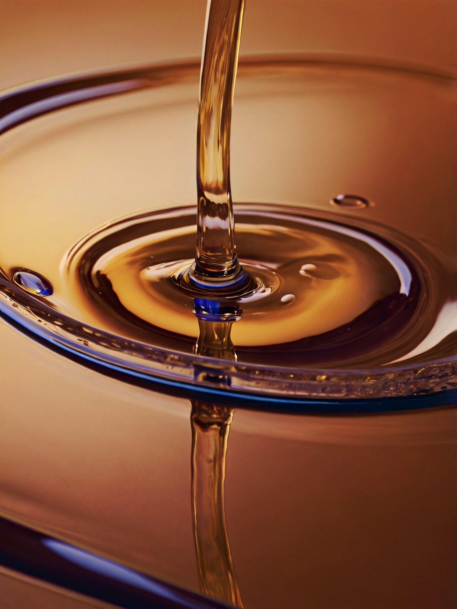 Golden liquid pouring into a pool, creating ripples and reflections. Warm lighting enhances the rich amber color and glossy texture.